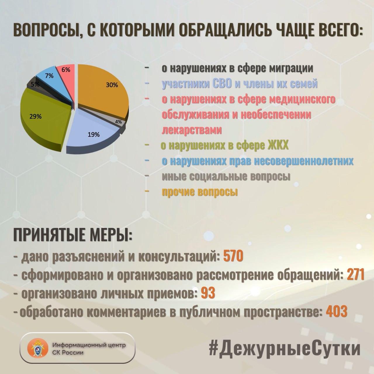 В Информационный центр СК России за прошедшие сутки всего обратилось граждан: 841
