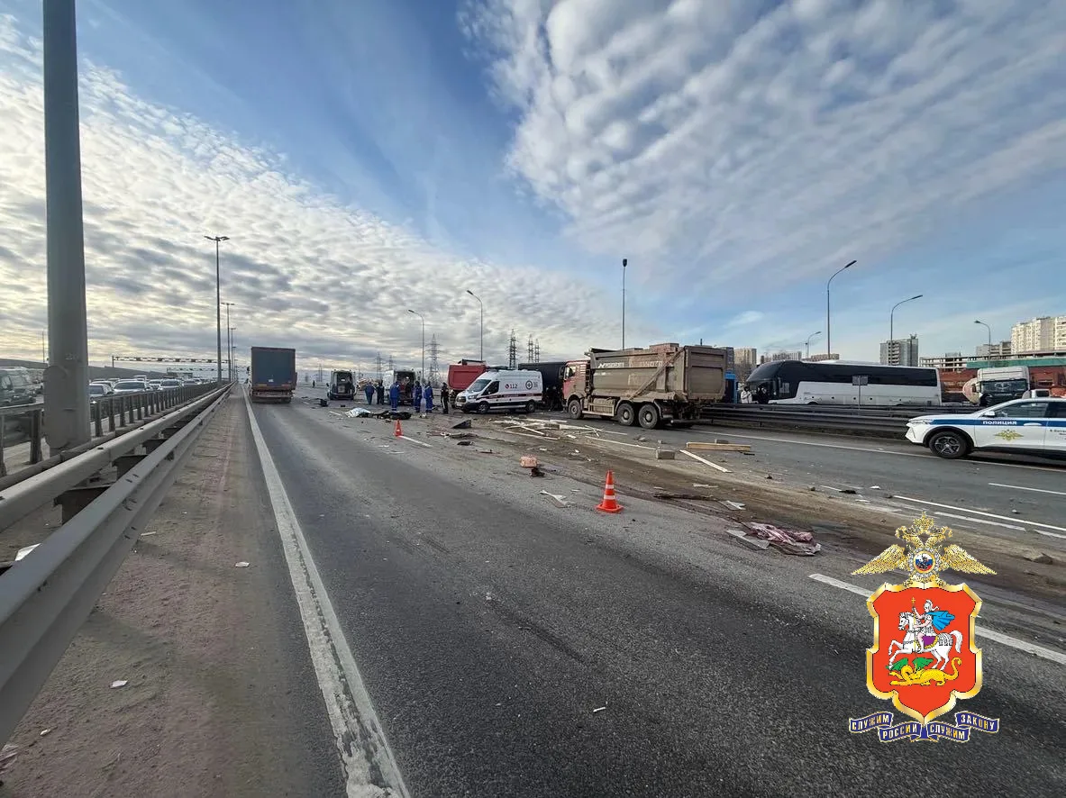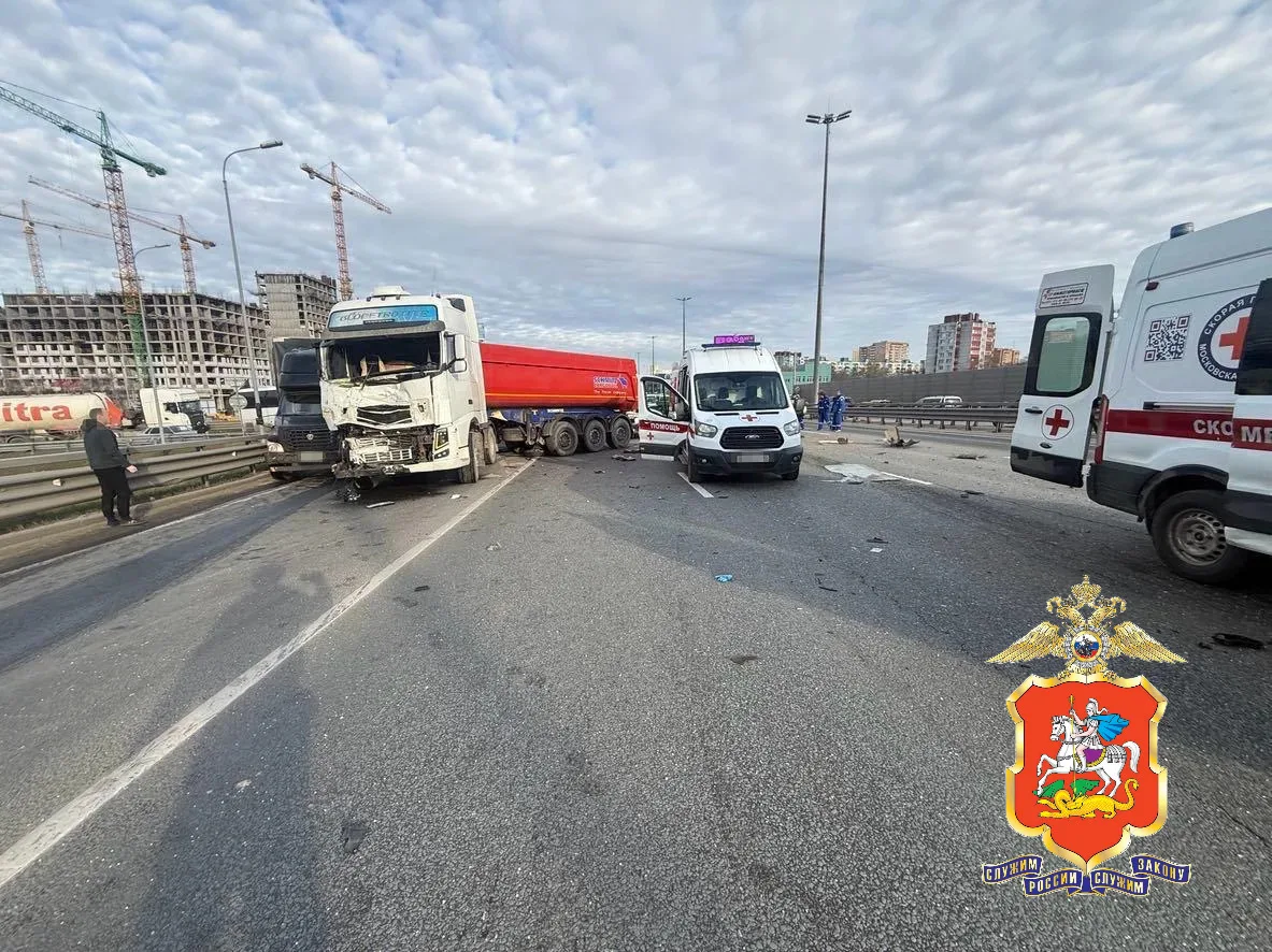 По информации полиции, грузовик врезался в стоящую на дороге по причине поломки машину марки "ГАЗ" на Новорязанском шоссе. РЕН ТВ...