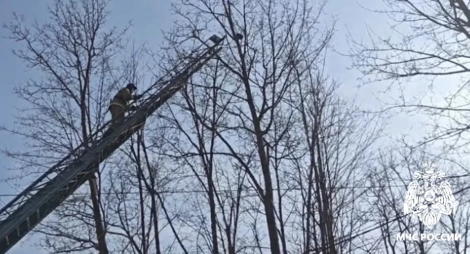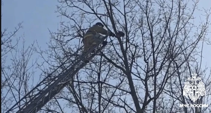 17 апреля на пульт поступил тревожный звонок. Местные жители сообщили: на дереве, на уровне четвёртого этажа, застрял кот. Самостоятельно спуститься животное не могло и громким мяуканьем призывало на помощь.