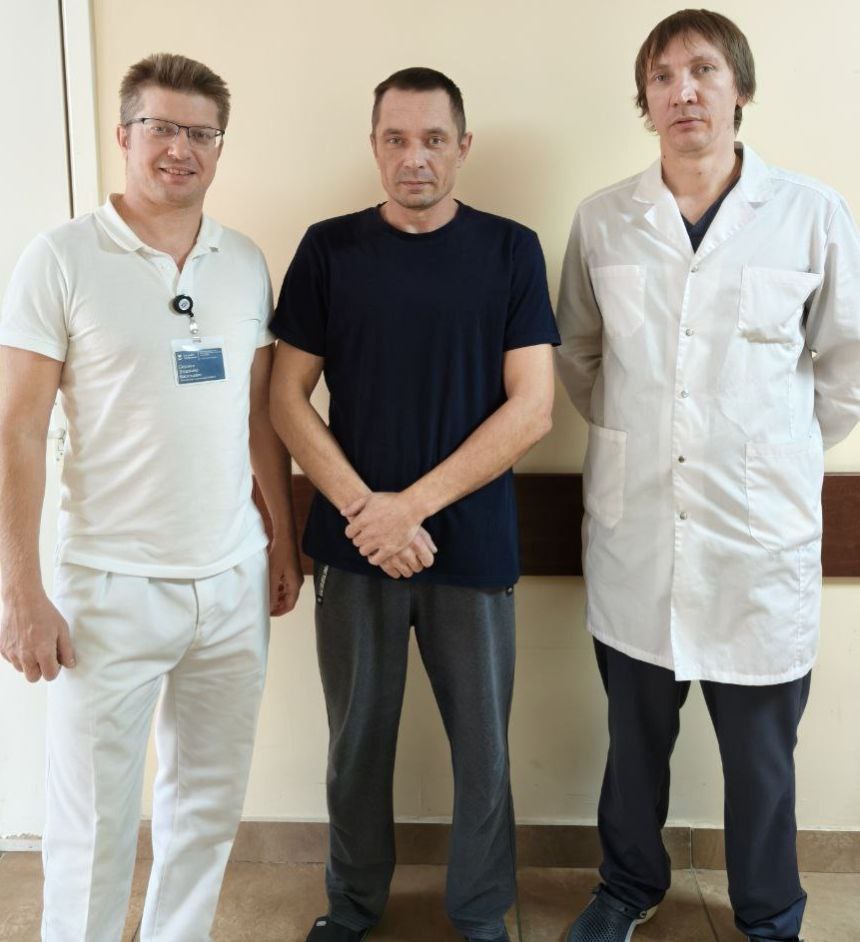 Заведующие отделениями сосудистой и эндоваскулярной хирургии нашей больницы Алексей Варин и Владимир Сорокин приняли решение применить для лечения больного гибридный метод: проведена сложнейшая операция по удалению тромба и атеросклеротических бляшек из бедренных артерий и выполнена её пластика. Затем установлен стент в подвздошную артерию.