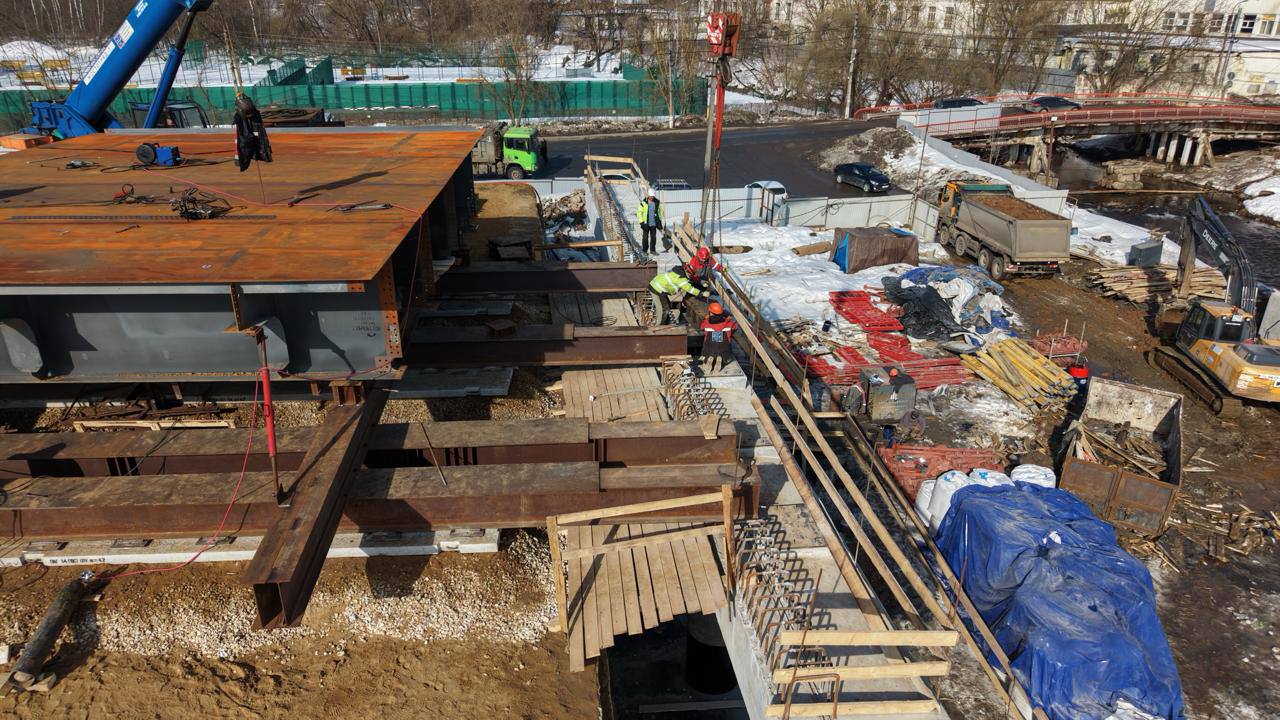 На строящемся мосту через р. Клязьму в Мытищах начали монтировать пролёт.