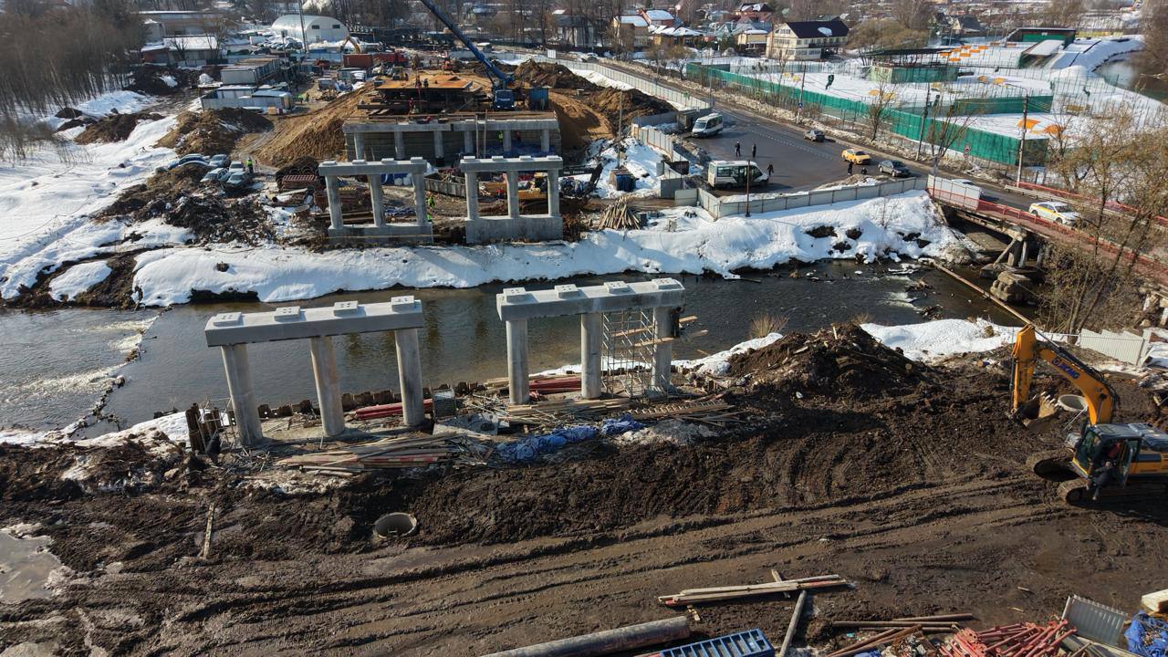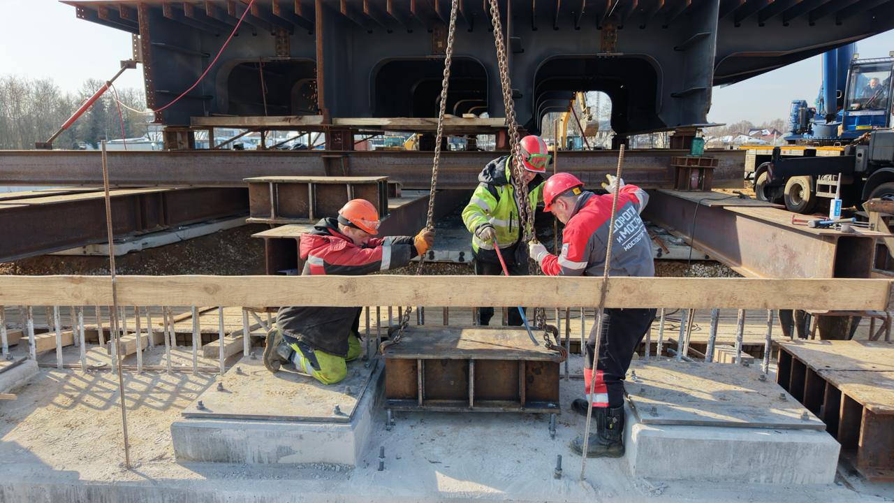 Министр транспорта Подмосковья Марат Сибатулин:"В настоящее время готовы все четыре опоры и буронабивные сваи. Строители завершили устройство стапеля и приступили к монтажу пролёта. Сейчас ведётся укрупнительная сборка металлоконструкций блоков пролёта. Также ведутся работы по устройству дождевой канализации, отсыпке земляного полотна".