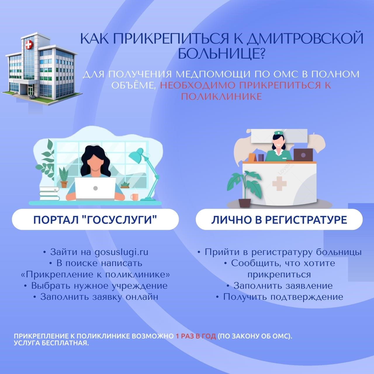 Важно знать заранее: прикрепление к поликлинике возможно 1 раз в год (по закону об ОМС). Услуга бесплатная.