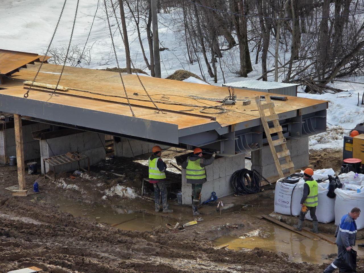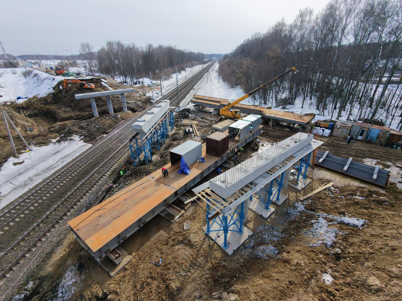 Сейчас идёт подготовка пролётных строений к монтажу над железной дорогой. Чтобы не останавливать движение поездов, массивные конструкции будущего моста собирают на земле, как большой конструктор. Когда всё будет готово, пролёты поднимут и установят над путями.