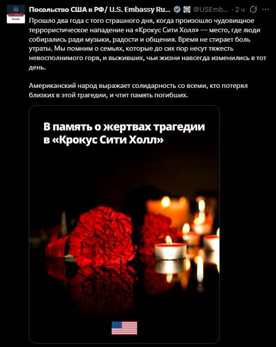 Посольство США в России выступило с заявлением в связи со второй годовщиной теракта в «Крокус Сити Холле». В дипмиссии напомнили, что трагедия произошла в месте, куда люди приходили ради музыки и общения, подчеркнув, что боль утраты не исчезает со временем.