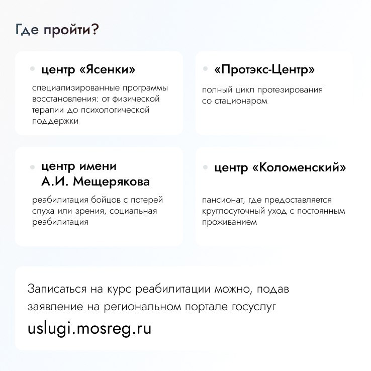 - Центр имени А.И. Мещерякова в Сергиевом Посаде – бесплатная реабилитация для бойцов со всей России с потерей слуха или зрения, обучение новым профессиям и социальная адаптация.