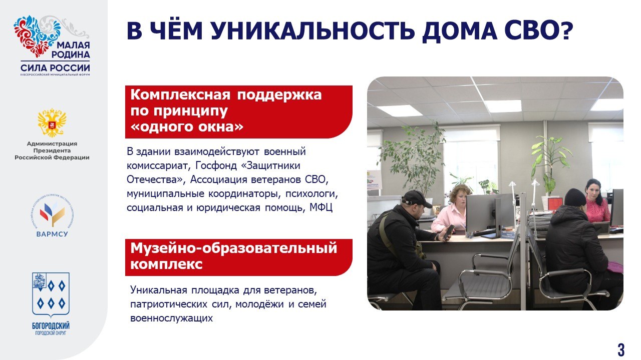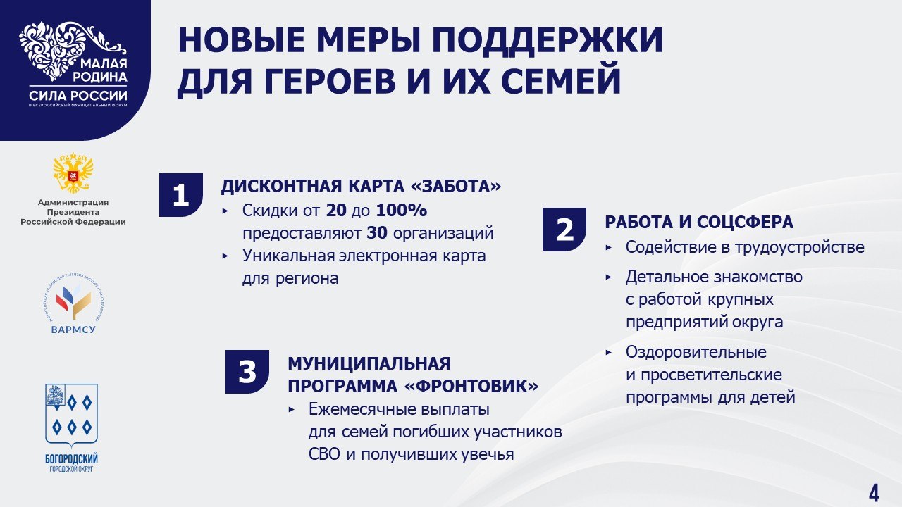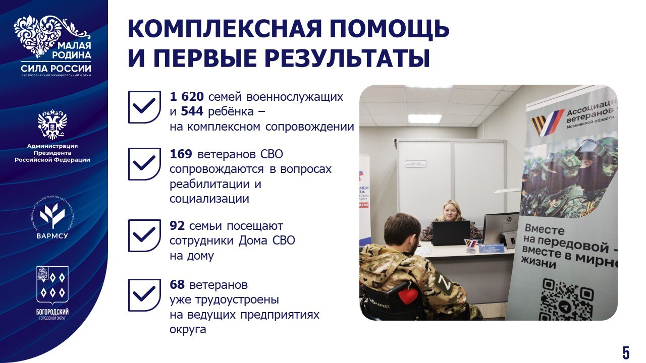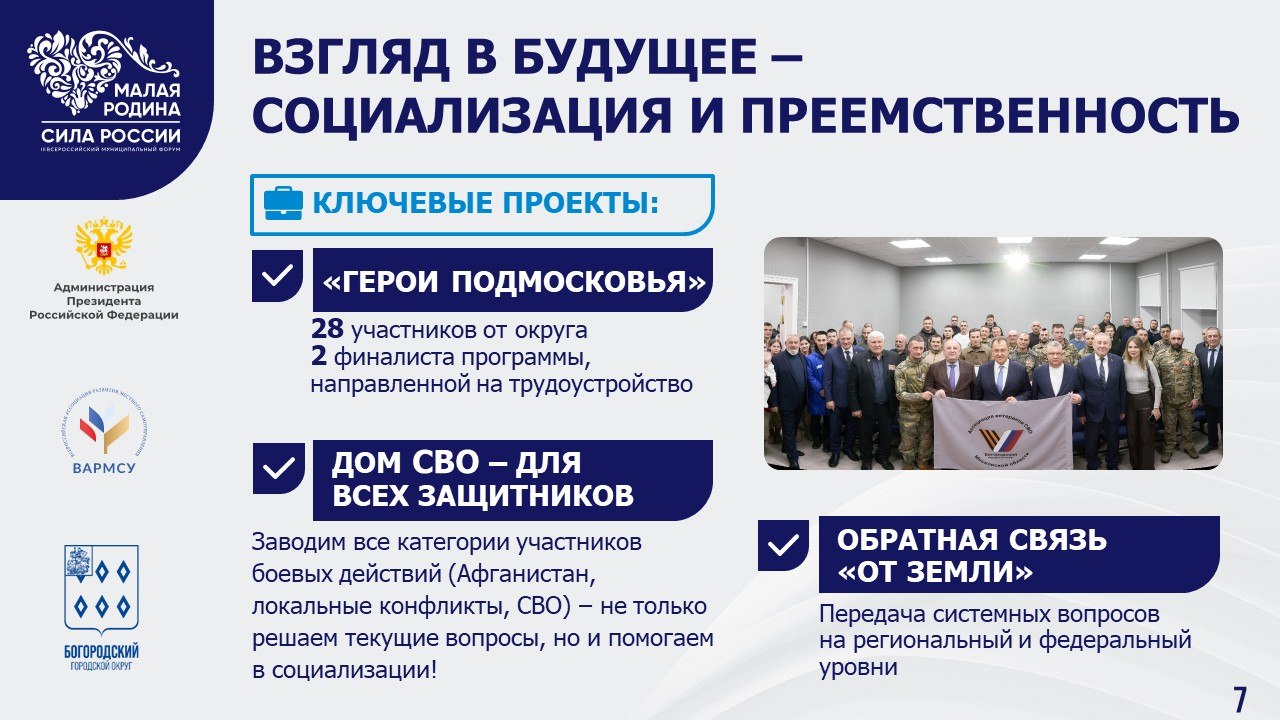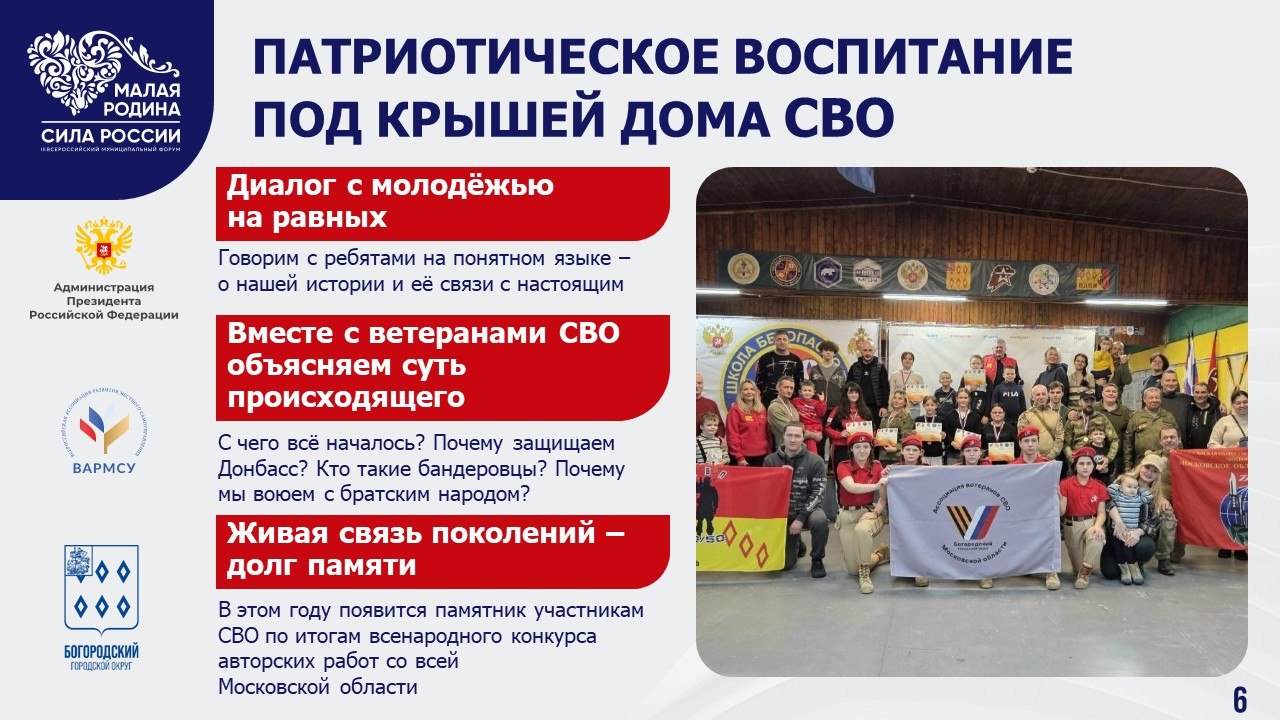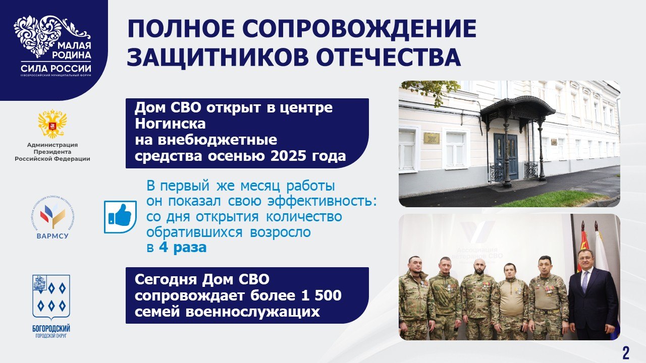 Для меня было большой честью принять участие в этом масштабном событии, выступить на тематической площадке, посвящённой механизмам поддержки участников СВО и их семей. Наш Богородский округ делает очень много в этом направлении. Достаточно сказать о Доме СВО в Ногинске – уникальном в своём роде для Подмосковья и муниципалитетов из других регионов страны.