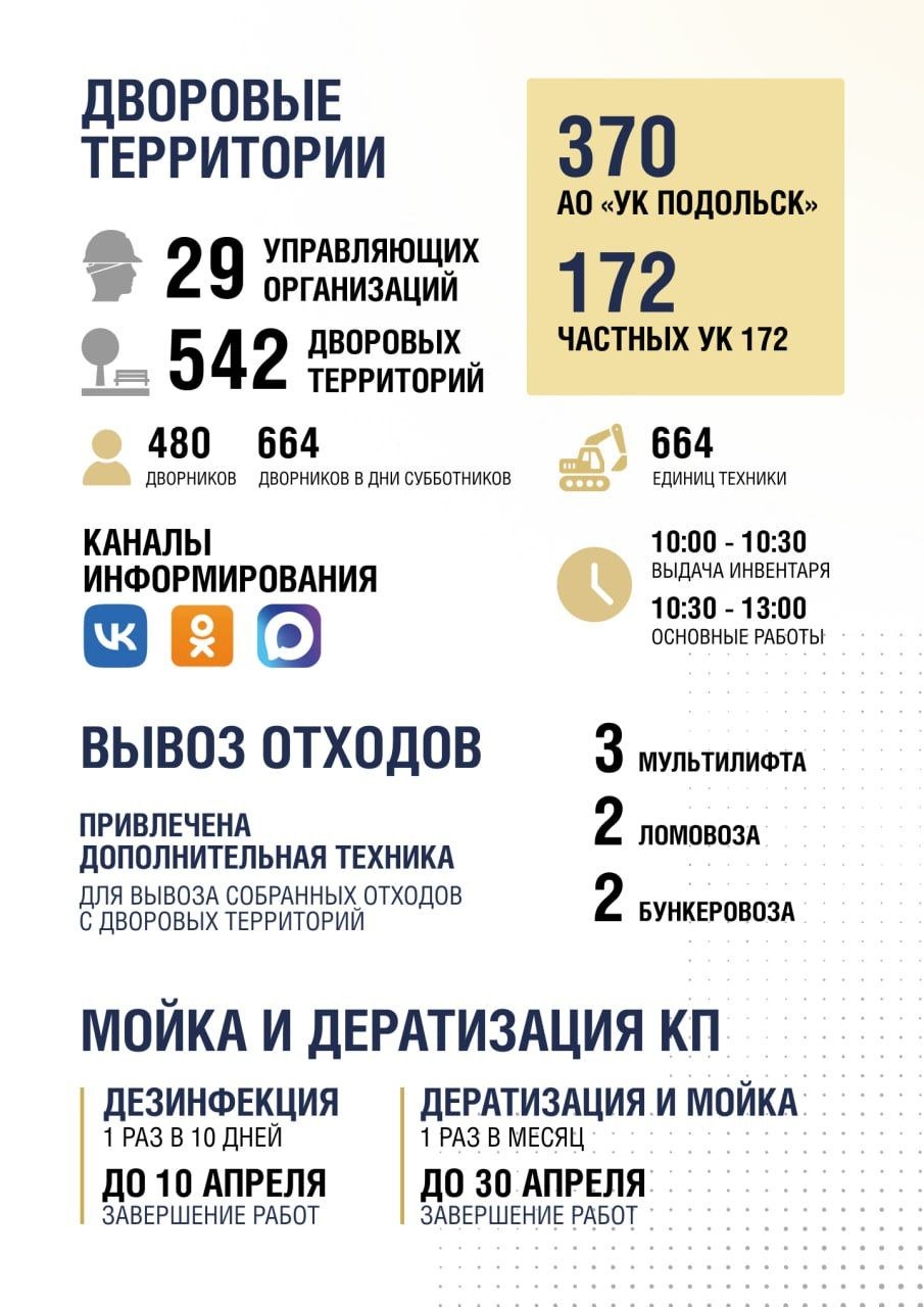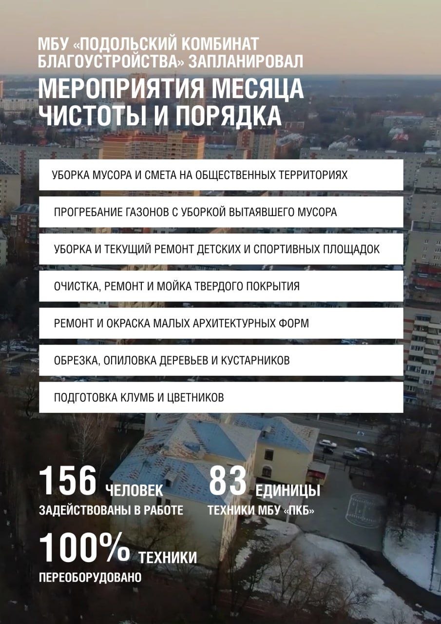 Работники Подольского комбината благоустройства выполняют широкий спектр задач: не только убирают мусор на общественных территориях, но и следят за состоянием детских и спортивных площадок, ремонтируют и окрашивают малые архитектурные формы, обрезают деревья и кустарники, готовят клумбы к высадке цветов. Вместе с этим идёт сезонная уборка улично-дорожной сети: подрядные организации совмещают механизированную и ручную уборку, моют проезжую часть, знаки, ограждения и автопавильоны, чистят труднодоступные участки и тротуары, а также оперативно выполняют ямочный ремонт.