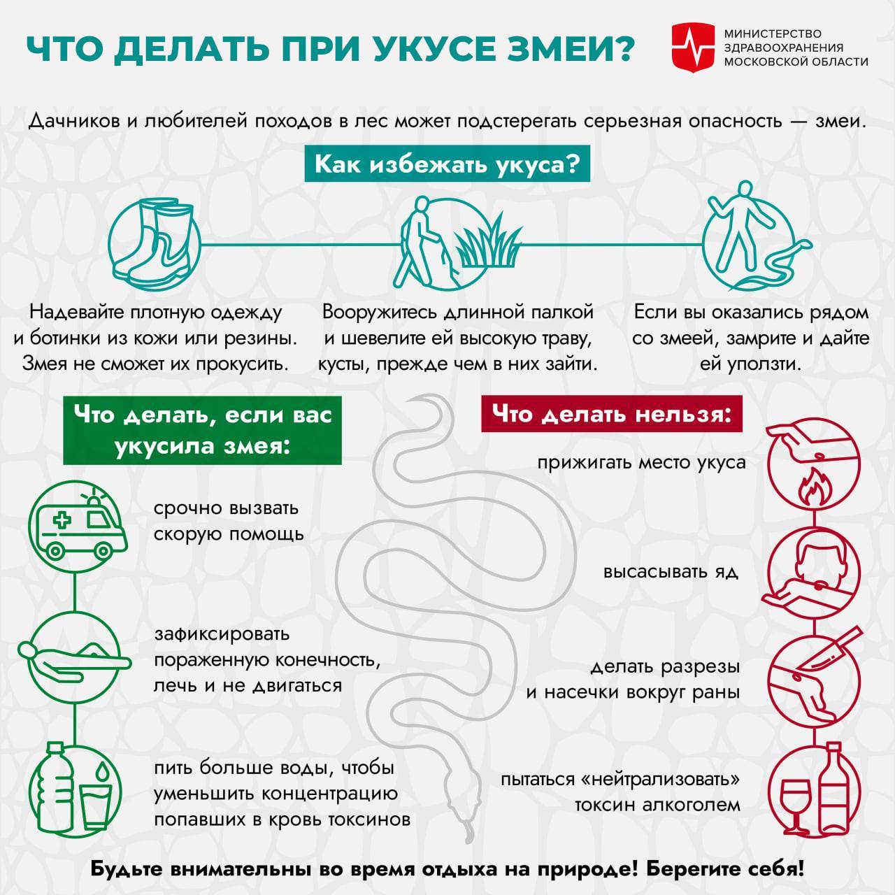 Важно: нельзя разрезать рану, накладывать жгут, прижигать или пытаться отсосать яд — это только ухудшит состояние. Алкоголь тоже под запретом.