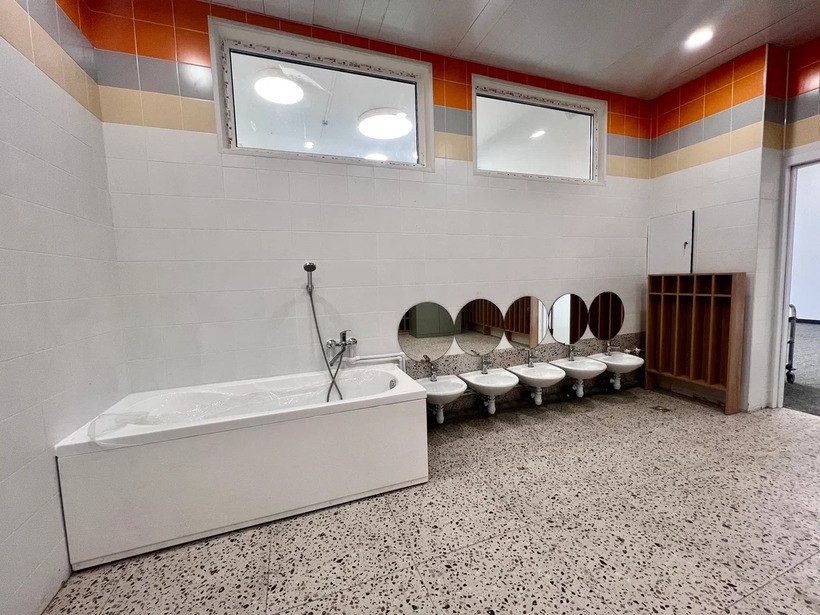 В саду - 10 групп (включая ясельные), медблок, логопед, музыкальный и спортзалы, выход на площадки с первого этажа.
