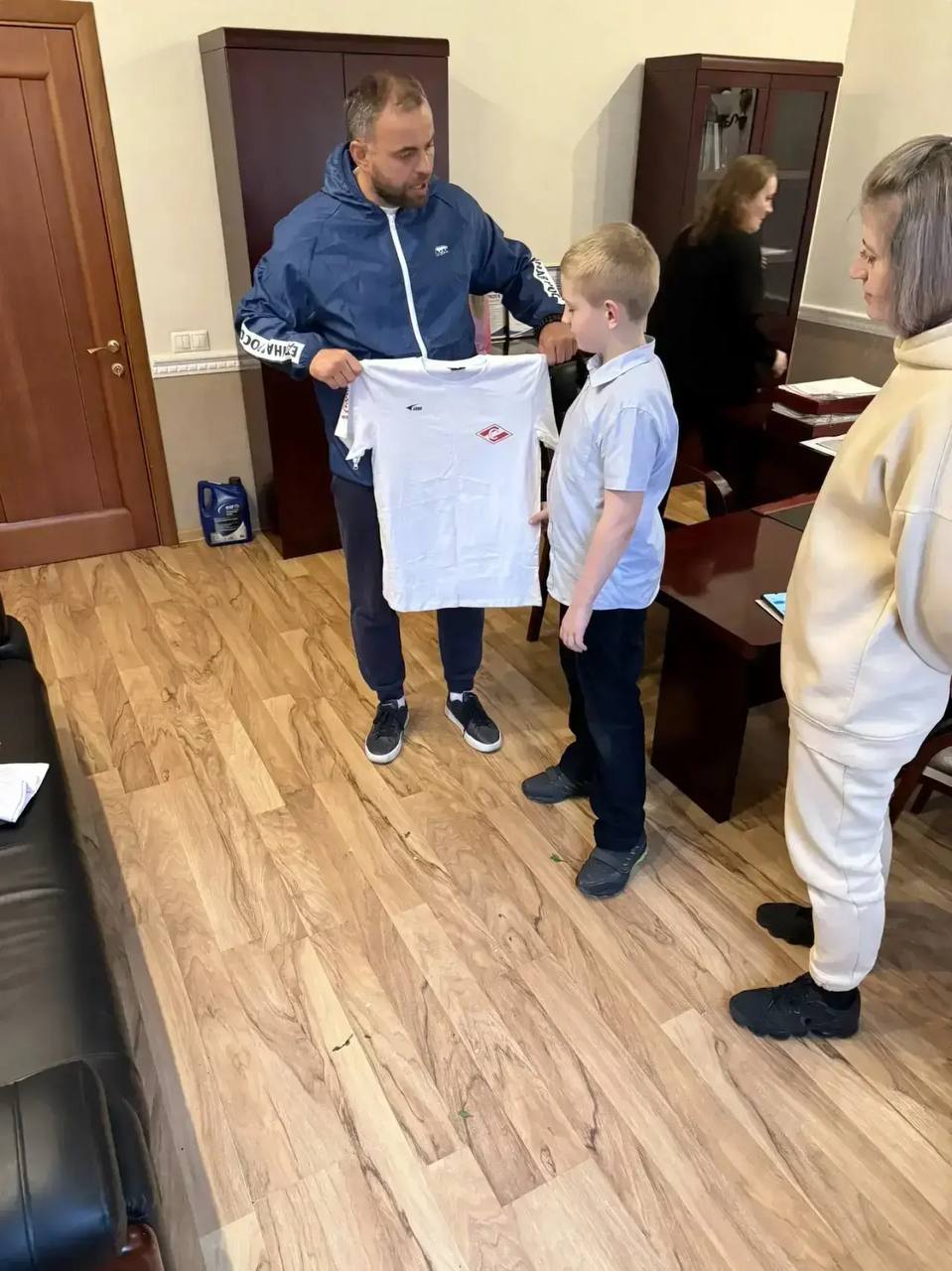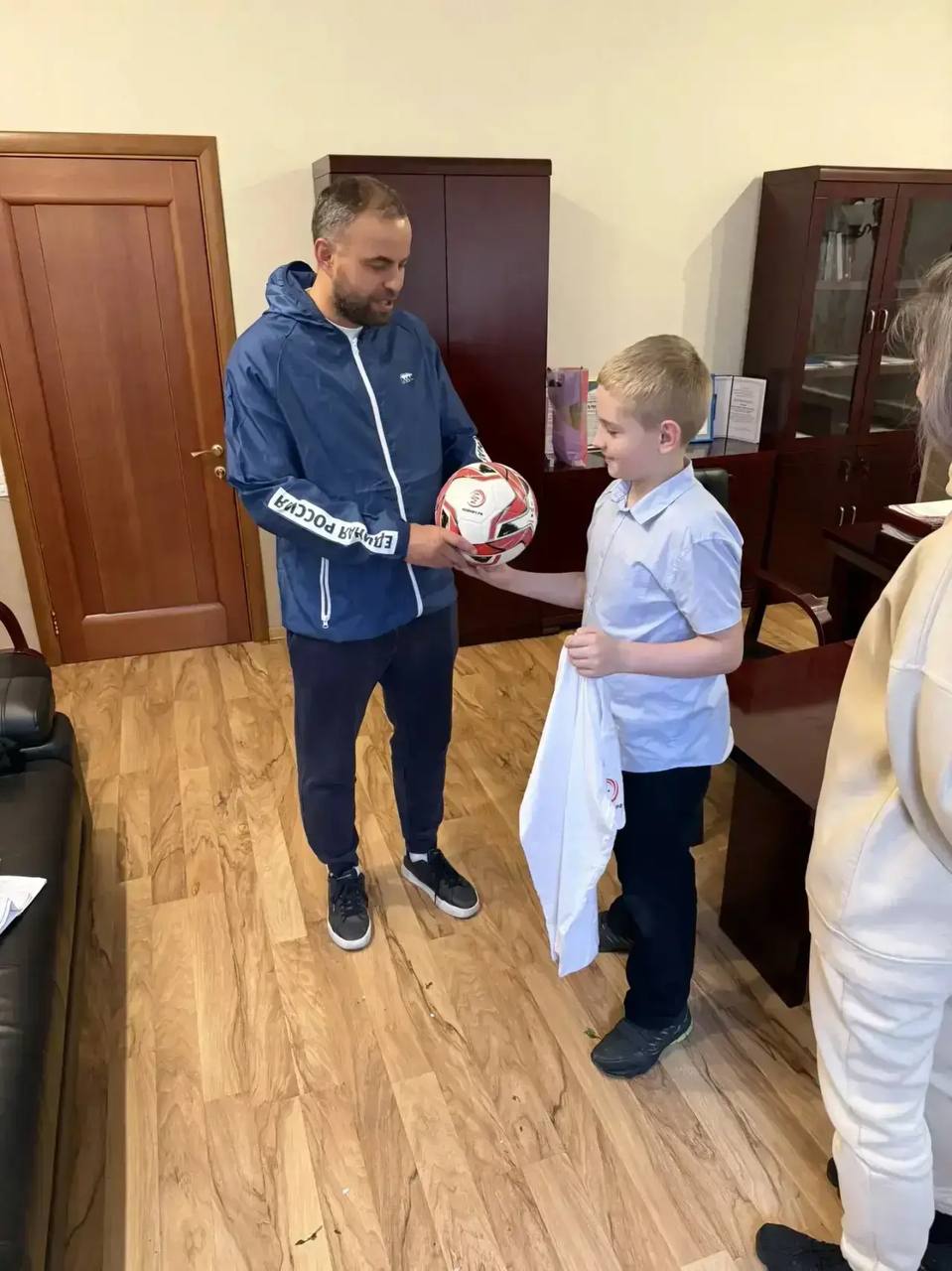 Мария воспитывает сына, на встрече с депутатом мальчик сказал, что хочет заниматься футболом. Для мотивации будущему спортсмену Дмитрий Кудинов подарил футболку с символикой красно-белых и игровой мяч.