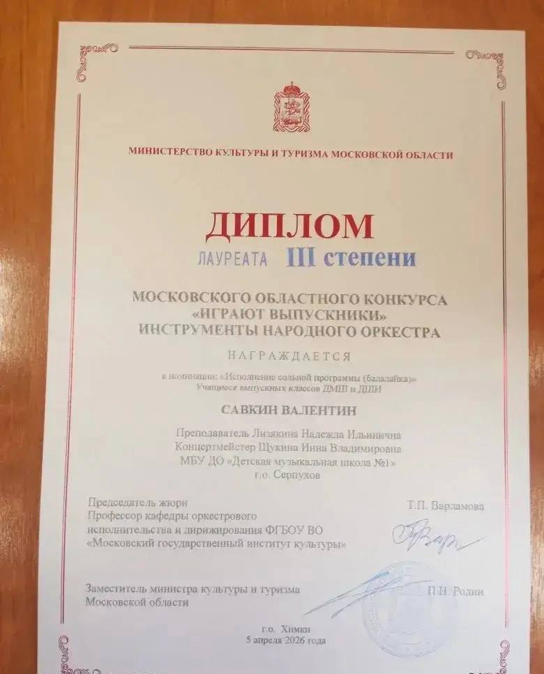 Серпухов достойно представил ученик выпускного класса — балалаечник Валентин Савкин, завоевавший звание Лауреата III степени. Вместе со своими наставниками — преподавателем Надеждой Лизякиной и концертмейстером Инной Щукиной — Валентин вновь подтвердил высокий профессиональный уровень и взял непростую планку.