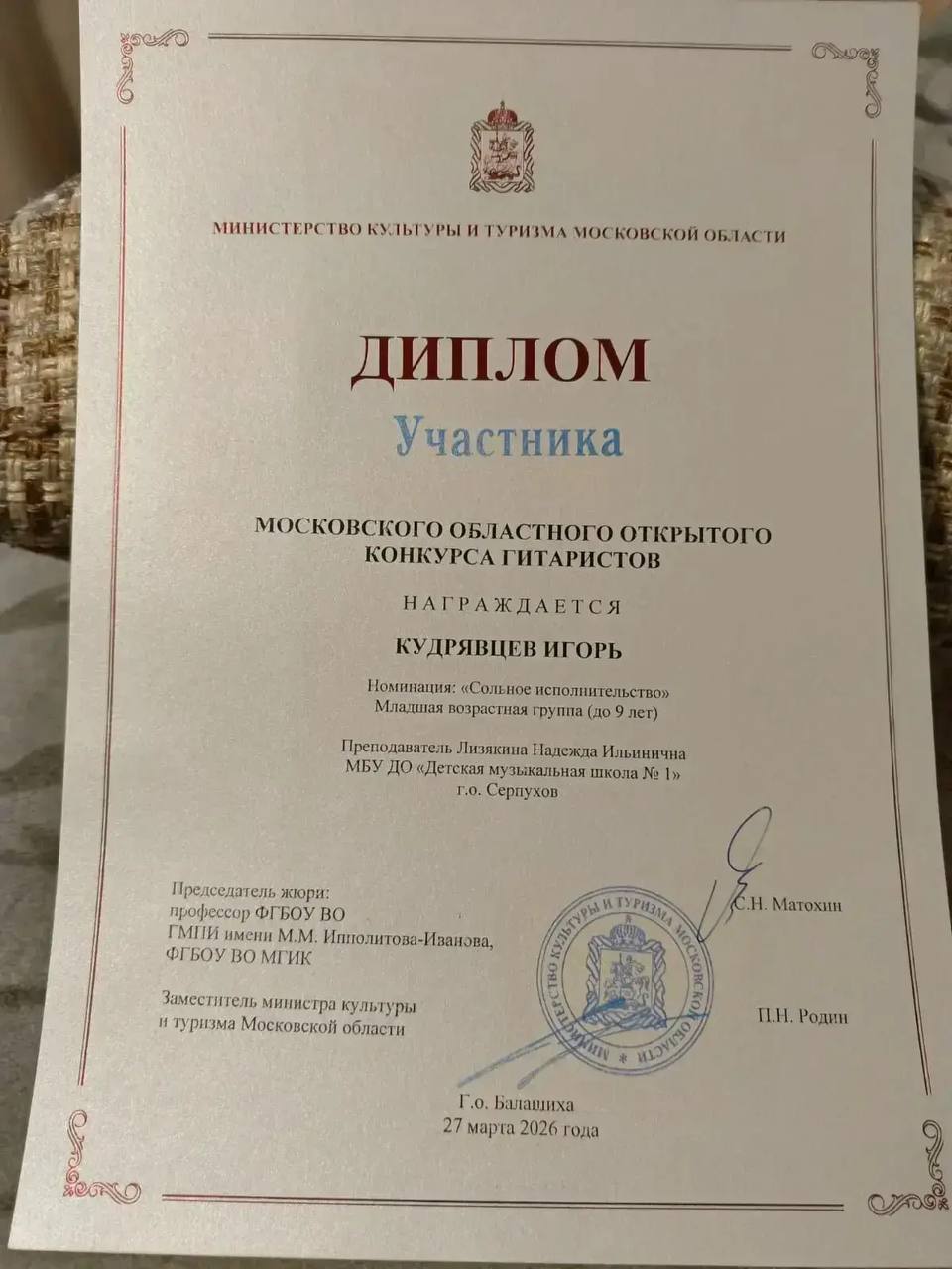 В этом же классе подрастает совсем юный музыкант. Кудрявцев Игорь, ученик первого класса, стал участником Московского областного открытого конкурса гитаристов, который прошёл в Балашихе. В возрастной категории до 9 лет Игорь успешно справился со сложной конкурсной программой.