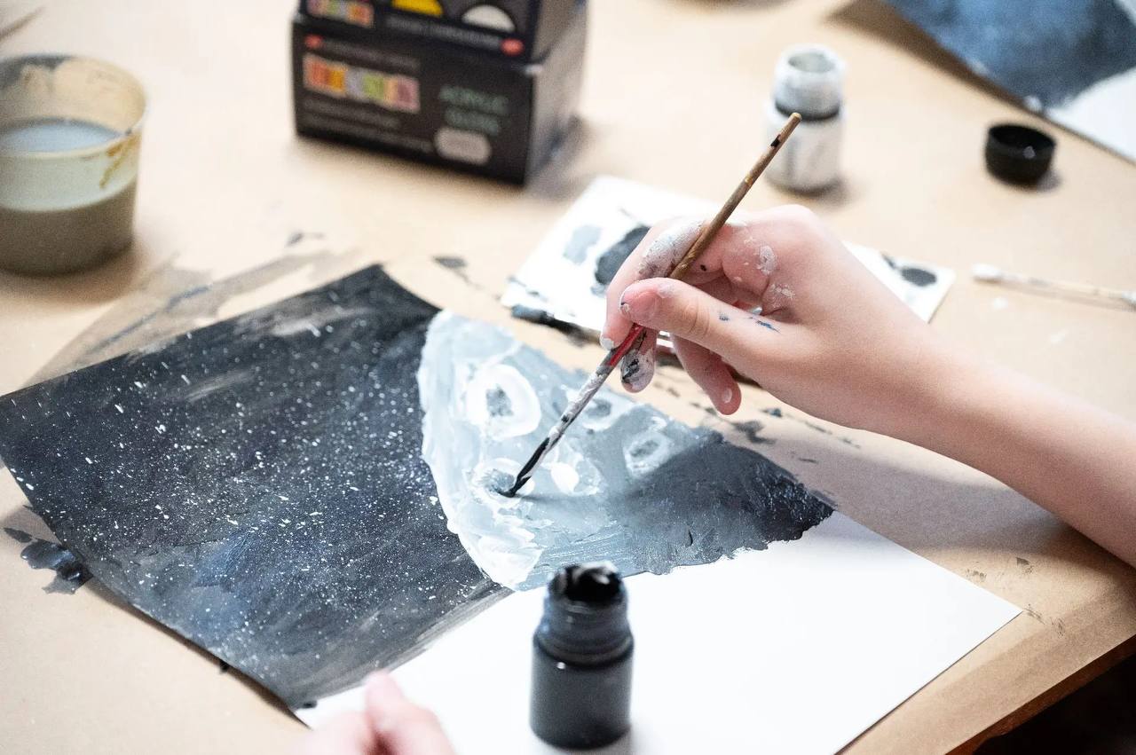 Ведущий методист Евгения Зыкова и её команда объяснили просто: «Сегодня рисуем Землю и её спутник — Луну». Без сложных схем. Только акрил, фантазия и тихий восторг, когда хаотичное пятно на листе вдруг превращается в мерцающую планету.