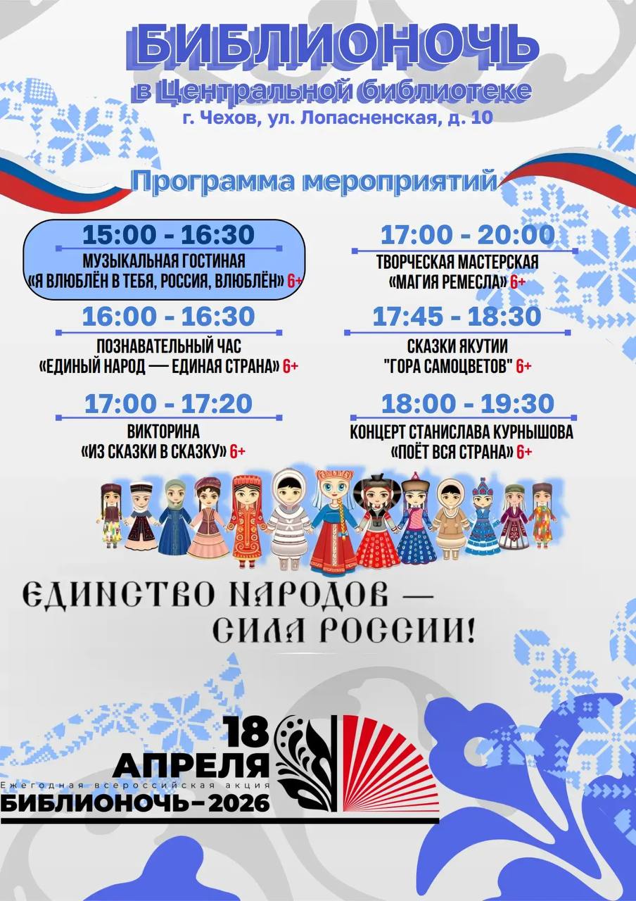 Приглашаем вас на особенный вечер в рамках ежегодной Всероссийской акции «Библионочь»! Откройте для себя удивительный мир музыки: вас ждёт уютный концерт «Я влюблён в тебя, Россия, влюблён» и знакомство с музыкальными традициями.