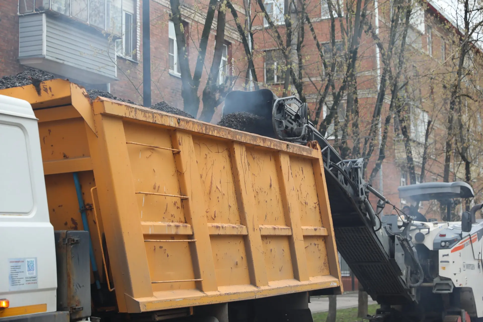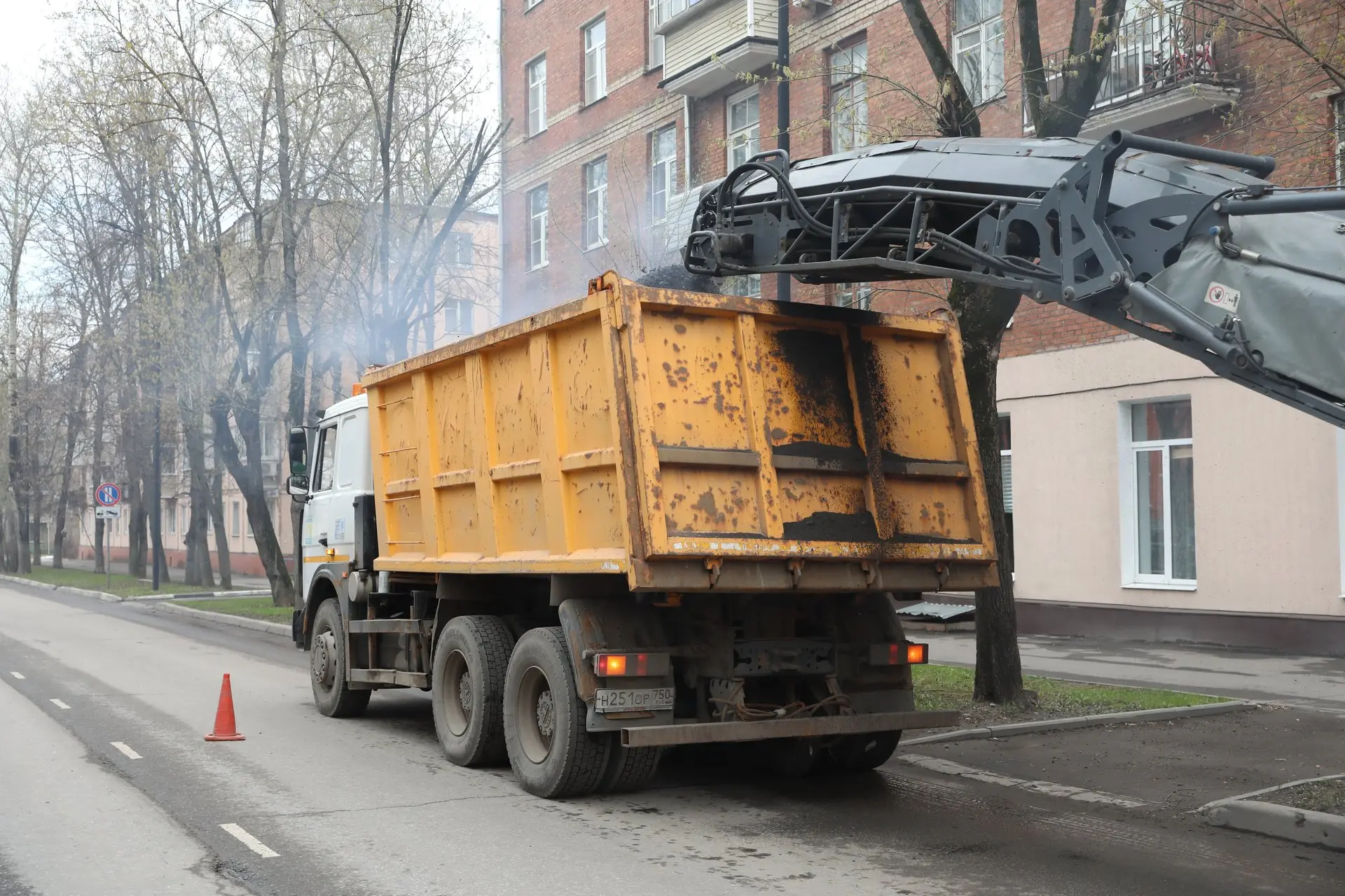 Благодаря спецтехнике отслуживший асфальт складируется сразу в грузовик и вывозится.