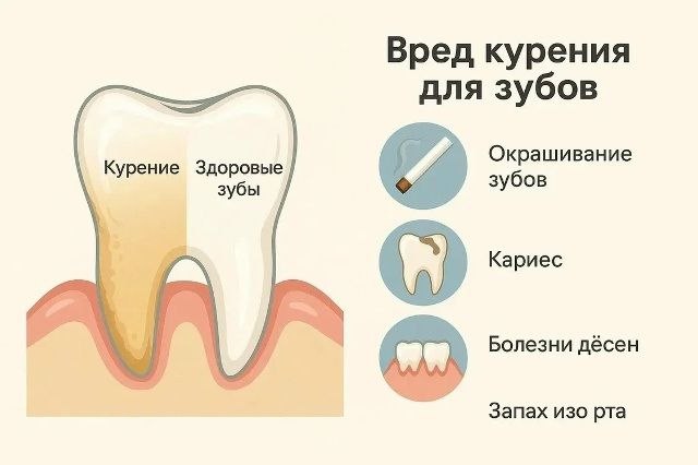 Курение значительно повышает риск развития кариеса, так как продукты горения табака создают идеальную среду для разрушения зубов.
