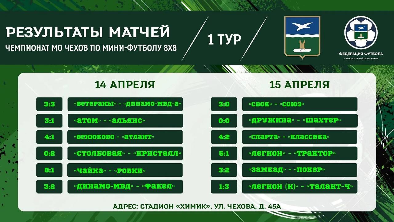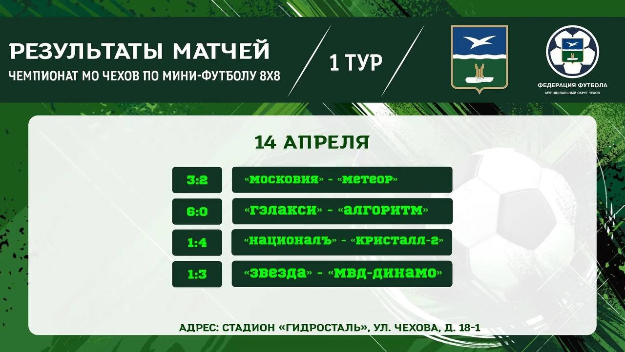 Результаты матчей 1 тура Чемпионата муниципального округа Чехов по мини-футболу 88, которые прошли 14 и 15 апреля на стадионе «Химик».