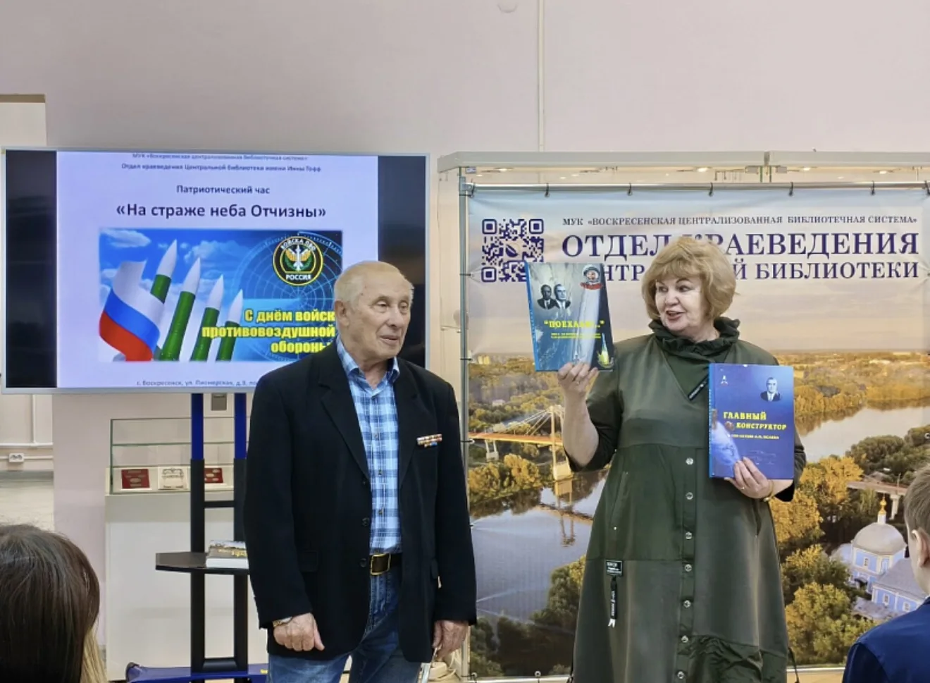 Заведующая отделом краеведения Елена Юрова показала ребятам книги воскресенских авторов на космическую тему. Елена Борисовна подчеркнула, что воскресенские предприятия и наши земляки вносят весомый вклад в защиту воздушного пространства России.