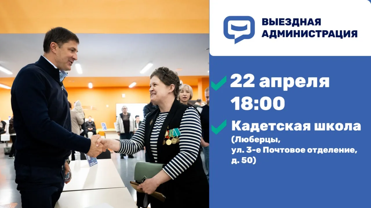 Глава г.о. Люберцы Владимир Волков проведет традиционную встречу с жителями в формате выездной администрации 22 апреля в Кадетской школе (Люберцы, ул. 3-е Почтовое отделение, д. 50).