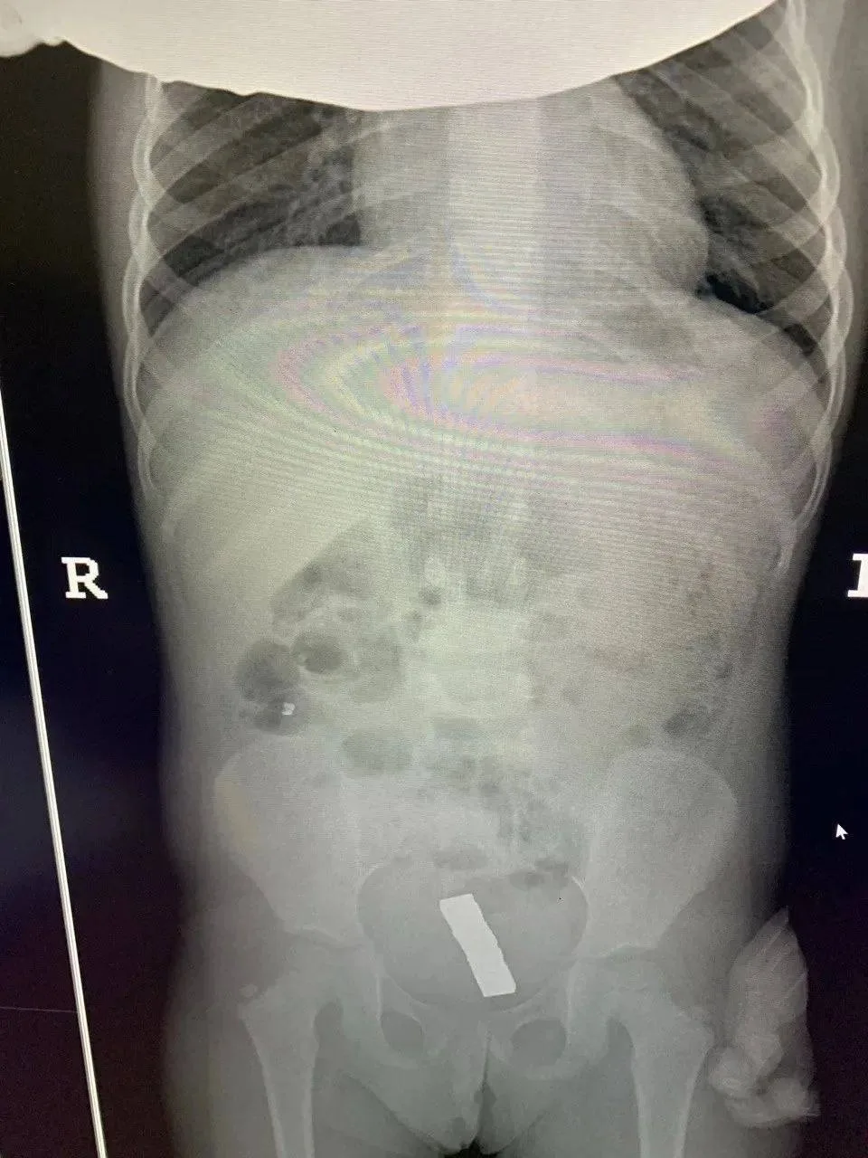 Девочка поступила в приёмное отделение филиала №2 с жалобами на сильные боли в животе. Пациентке провели рентген брюшной полости на котором было обнаружено наличие инородных тел металлического характера.