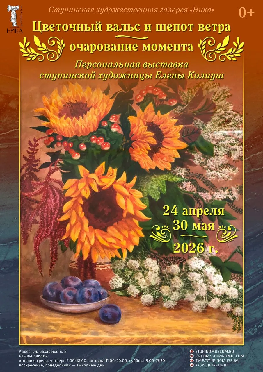 С 24 апреля по 30 мая в ступинской художественной галерее «Ника» откроется персональная выставка «Цветочный вальс и шепот ветра — очарование момента». Автор представленных произведений — Елена Колиуш, продолжающая традиции школы Сергея Андрияки.