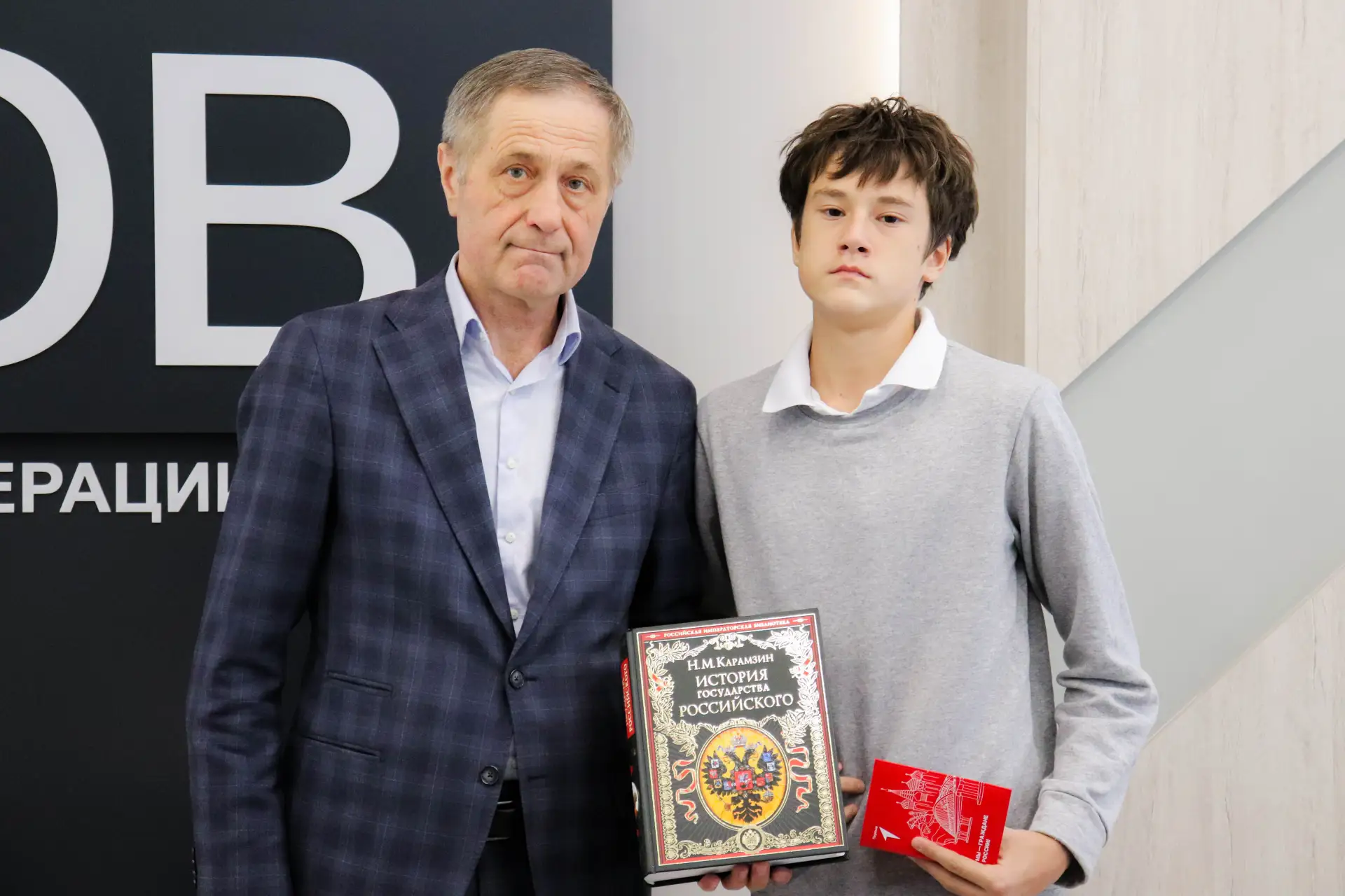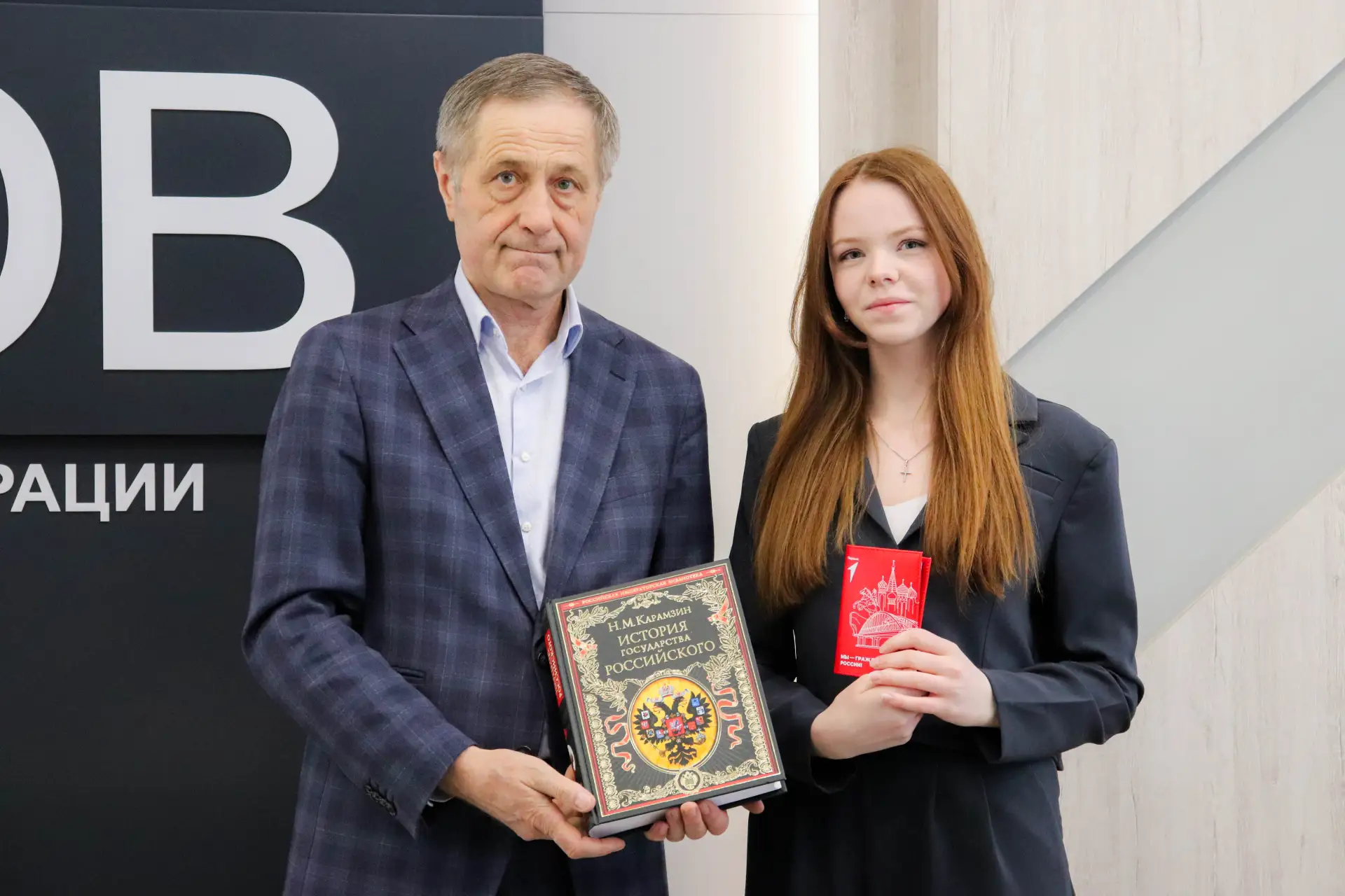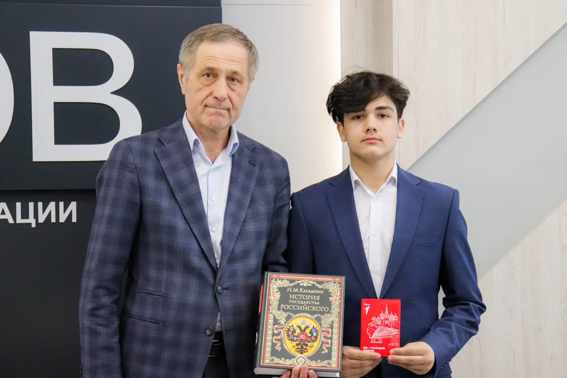Вместе с документом, удостоверяющим личность, школьникам вручили памятные книги «История государства Российского» Николая Карамзина и значки Общероссийского общественно-государственного движения детей и молодёжи «Движение Первых».