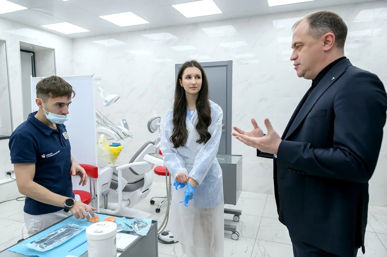Главный врач Домодедовской стоматологии Михаил Каюгин провёл для школьницы подробную экскурсию: показал все отделения поликлиники и рассказал, как устроена работа медучреждения изнутри.