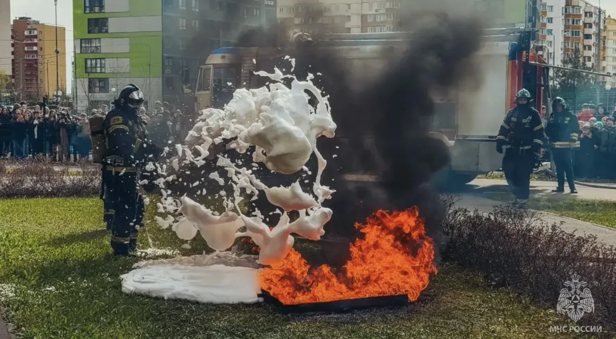 Потушили условное возгорание на территории с применением пожарно-пенной установки.