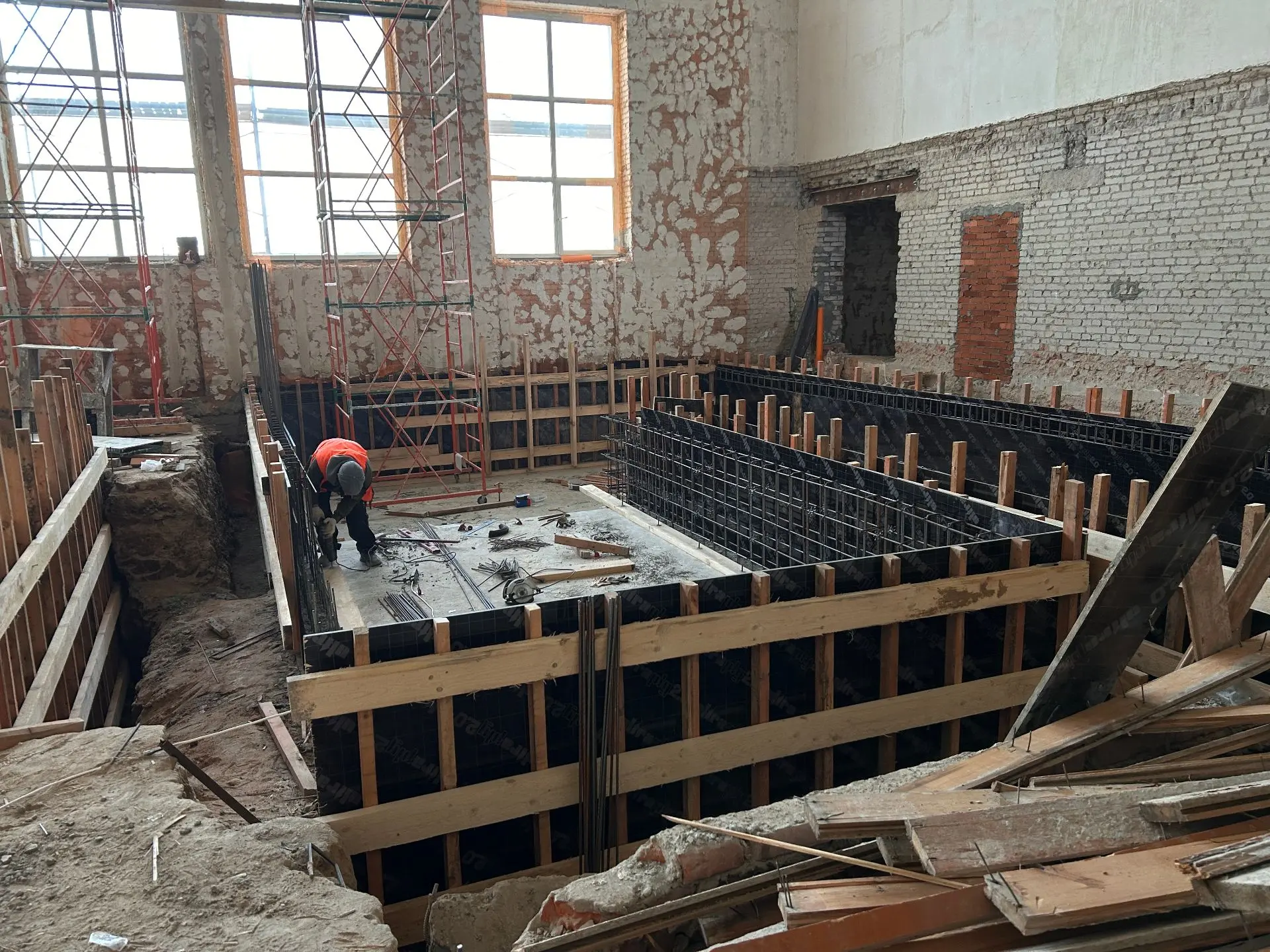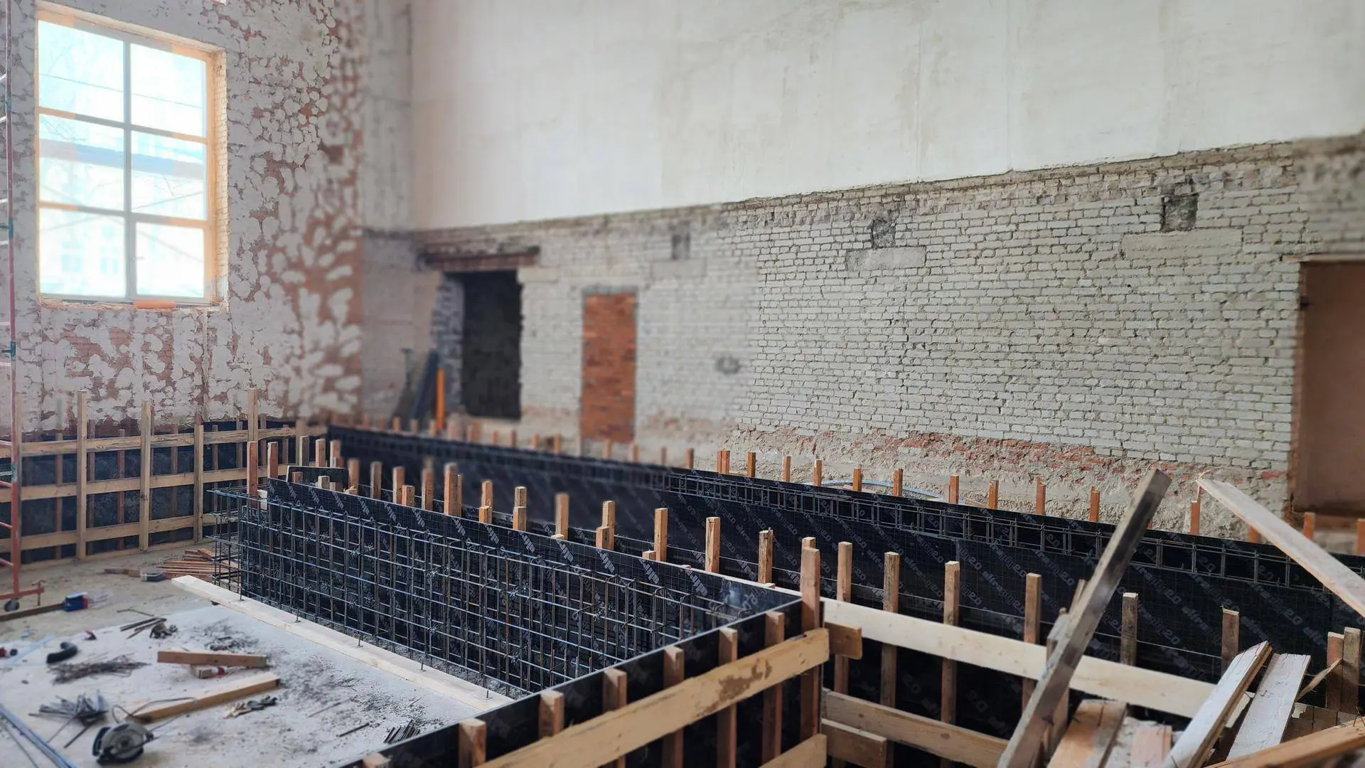 В других помещениях готовятся полы под стяжку, штукатурятся стены, монтируются системы отопление и водоснабжение, вывозится строительный мусор. На объекте работают 34 человека.
