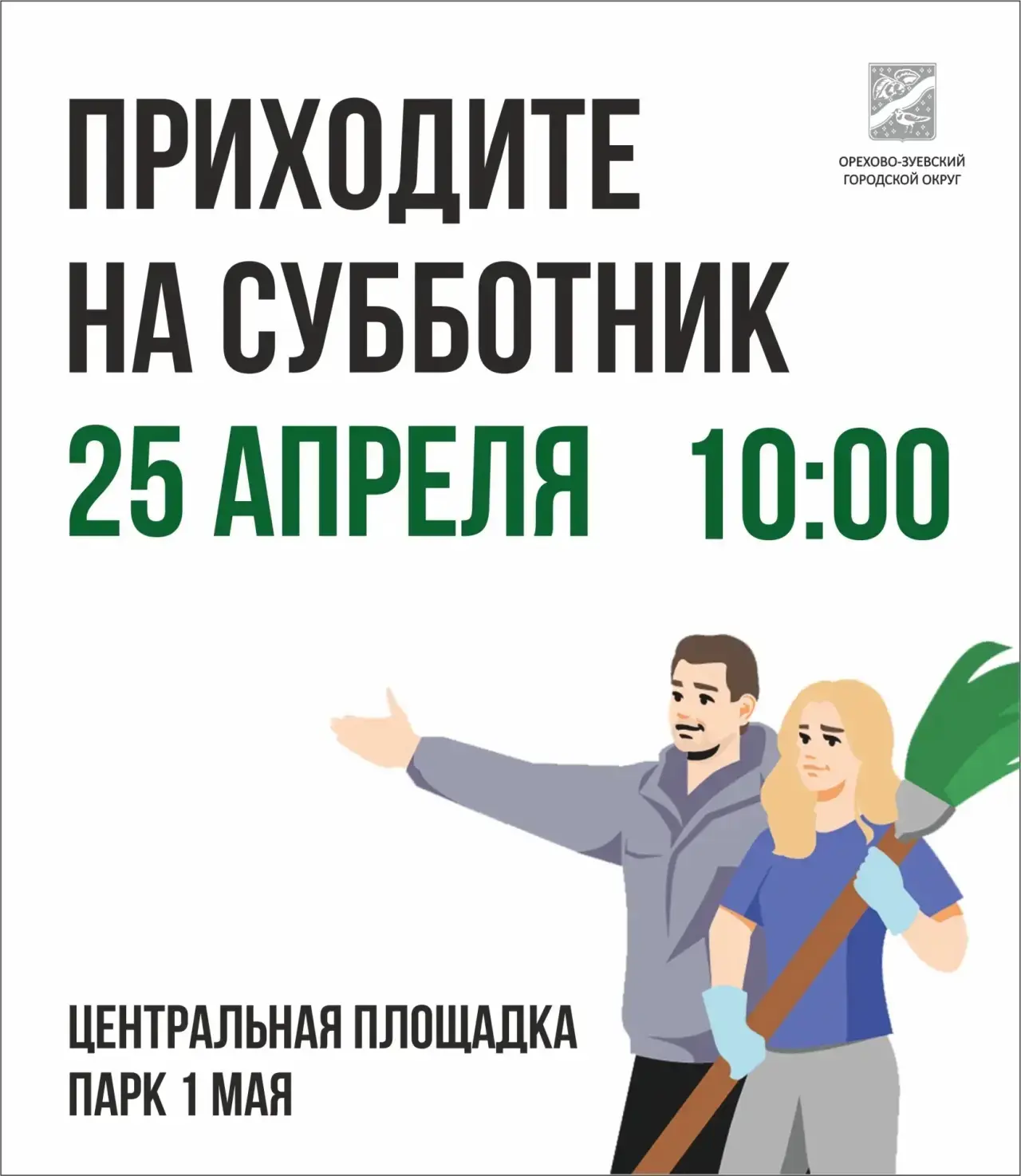 Приглашаю вас присоединиться к общеобластному субботнику, который состоится 25 апреля в 10.00. Центральной площадкой в Орехово-Зуеве станет Парк 1 Мая.