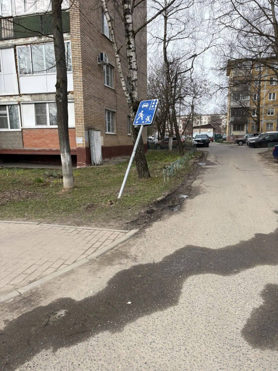 В ходе осмотра территории был выявлен практически упавший знак. Технический осмотр показал, что причиной падения стало не влияние погоды, а целенаправленное человеческое воздействие. Кто-то намеренно расшатал и погнул металлическую опору.
