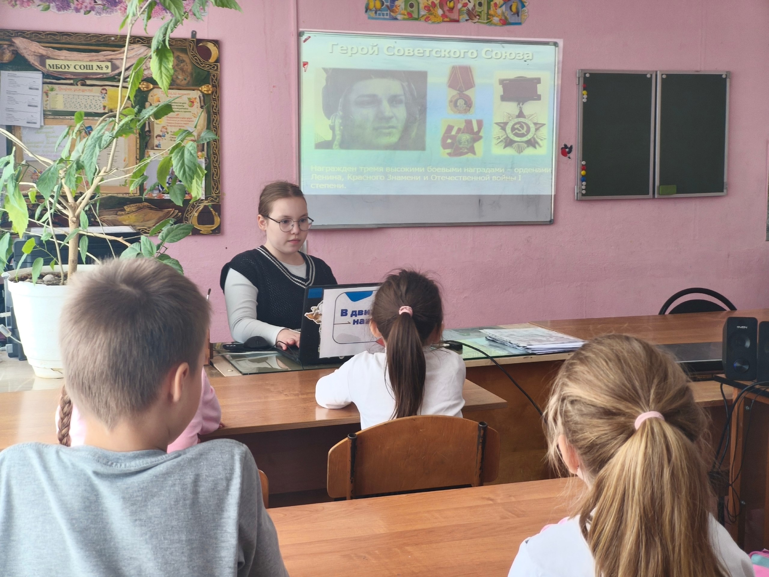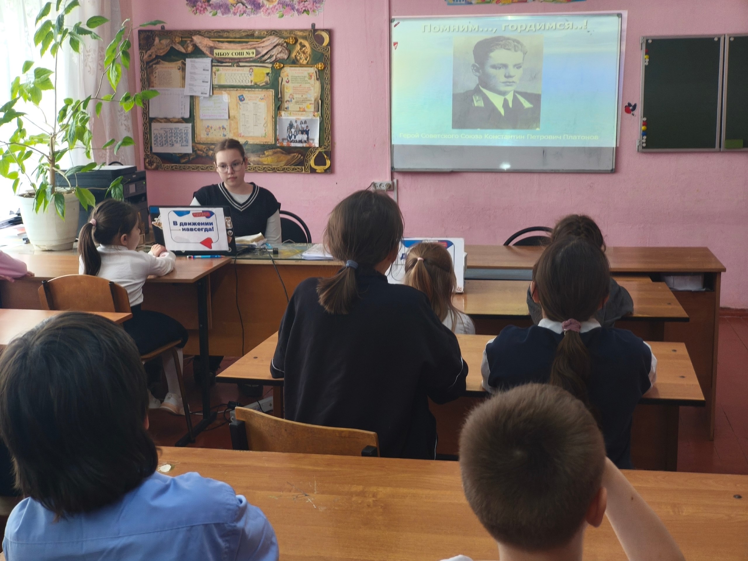 В МБОУ СОШ № 9 прошел урок Мужества «Подвиг — это космос в одном человеке», посвящённый лауреатам Всероссийской общественно-государственной инициативы с международным участием «Горячее сердце». Учащиеся вспомнили подвиг Героя Советского Союза К.П. Платонова.