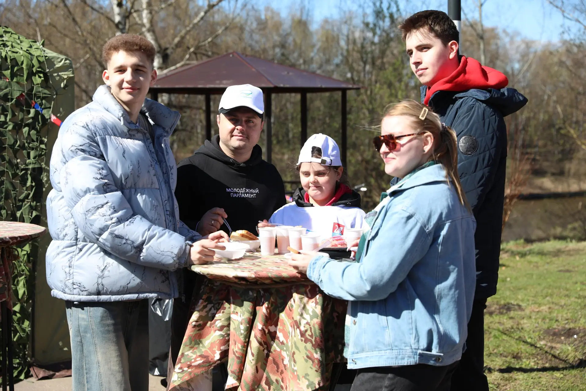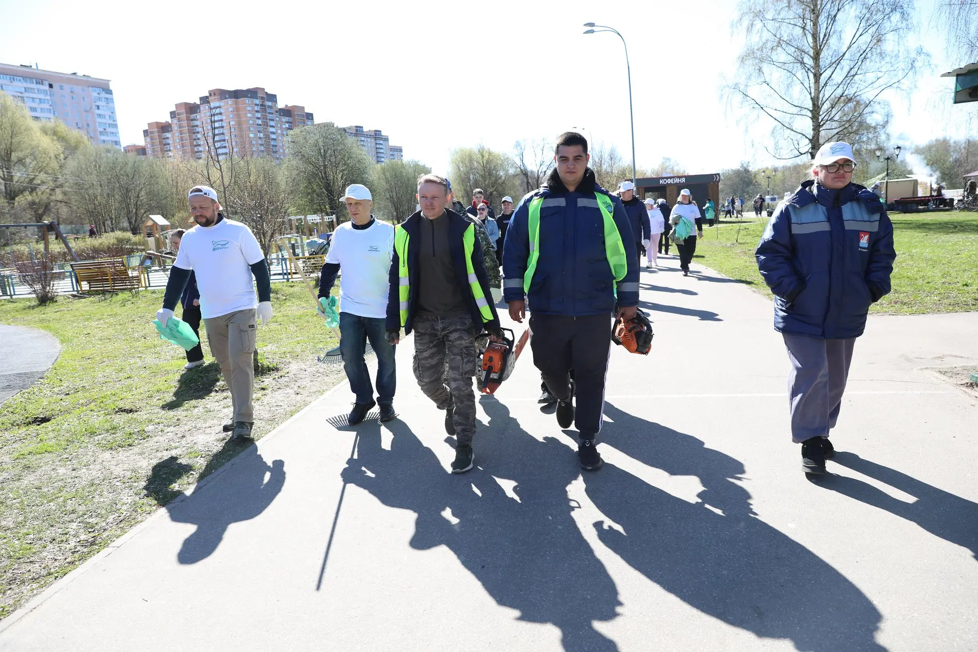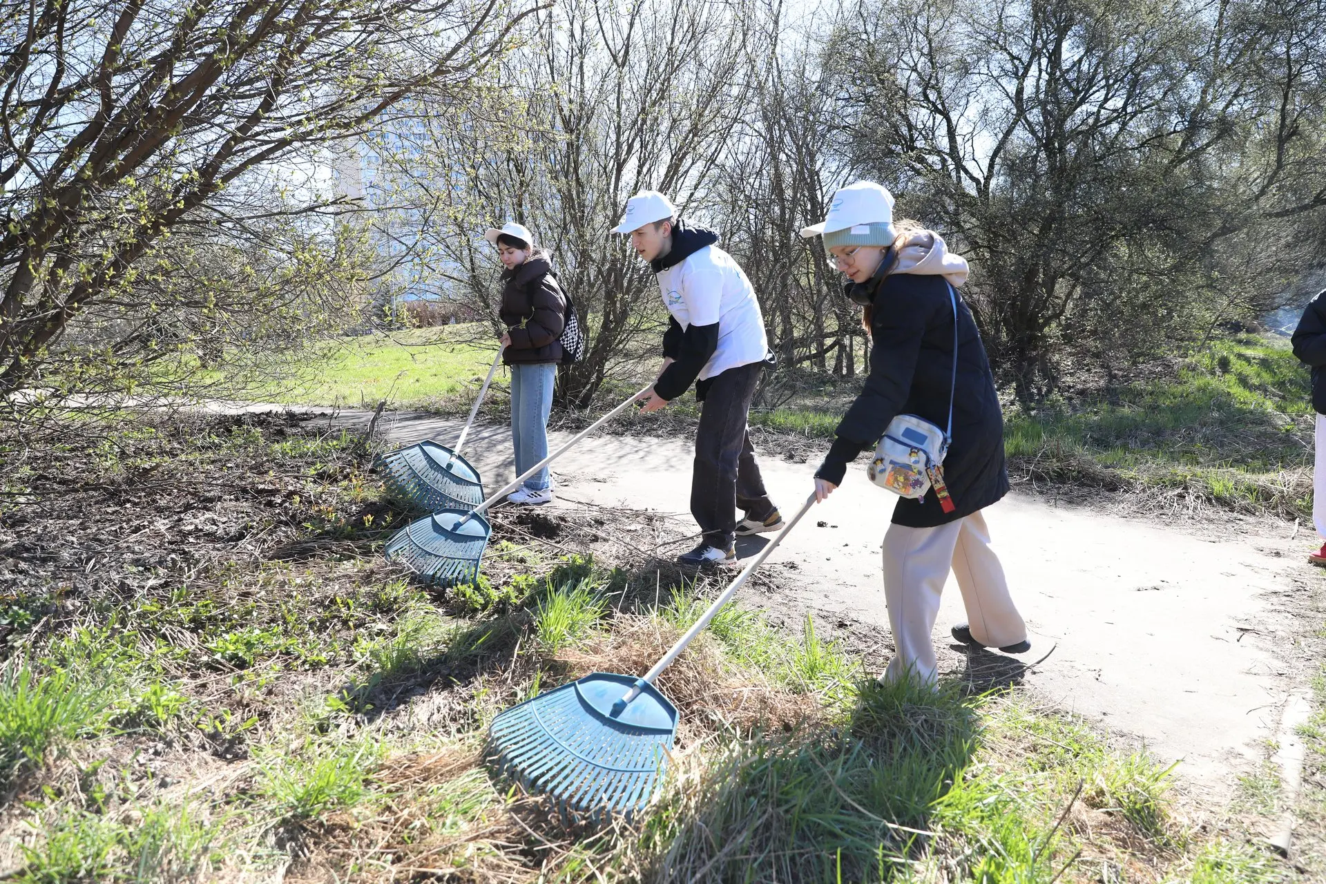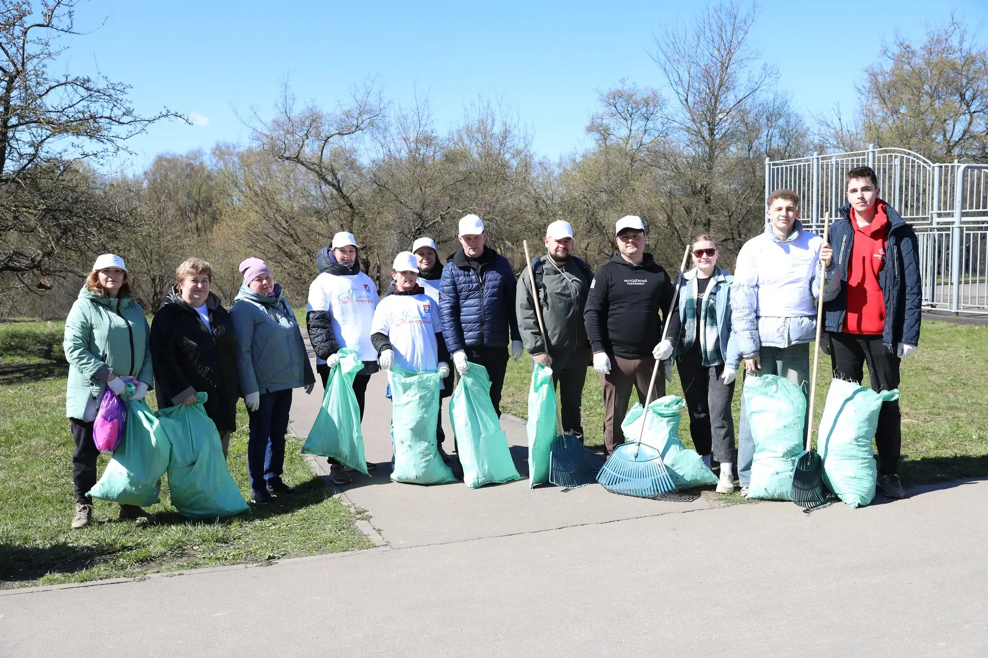 Участники субботника получили кепки и футболки с символикой мероприятия, а также грабли, лопаты, защитные перчатки и мешки.