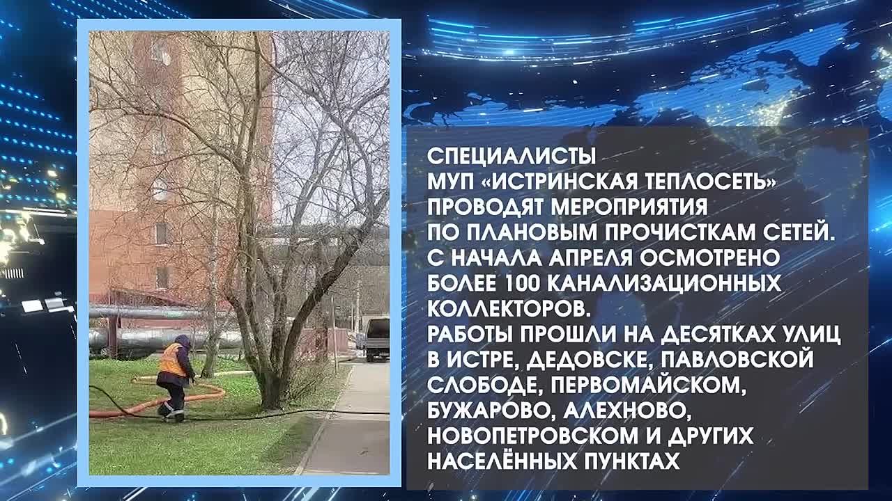 Специалисты МУП «Истринская теплосеть» проводят мероприятия по плановым прочисткам сетей. С начала апреля осмотрено более 100 канализационных коллекторов. Работы прошли на десятках улиц в Истре, Дедовске, Павловской Слободе, Первомайском, Бужарово, Алехново, Новопетровском и других населённых пунктов.