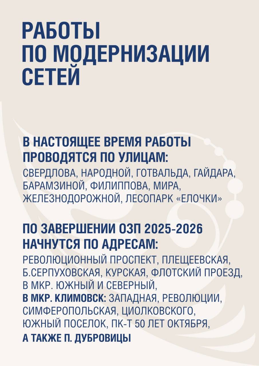 Работы начнутся в котельных на Революционном проспекте, улицах Плещеевская, Большая Серпуховская, Курская, Флотском проезде, микрорайонах Южном и Северном. А также в микрорайоне Климовск в котельных на улицах Западная, Революции, Симферопольская, Циолковского, Южный посёлок, проспект 50 лет Октября) и в посёлке Дубровицы.