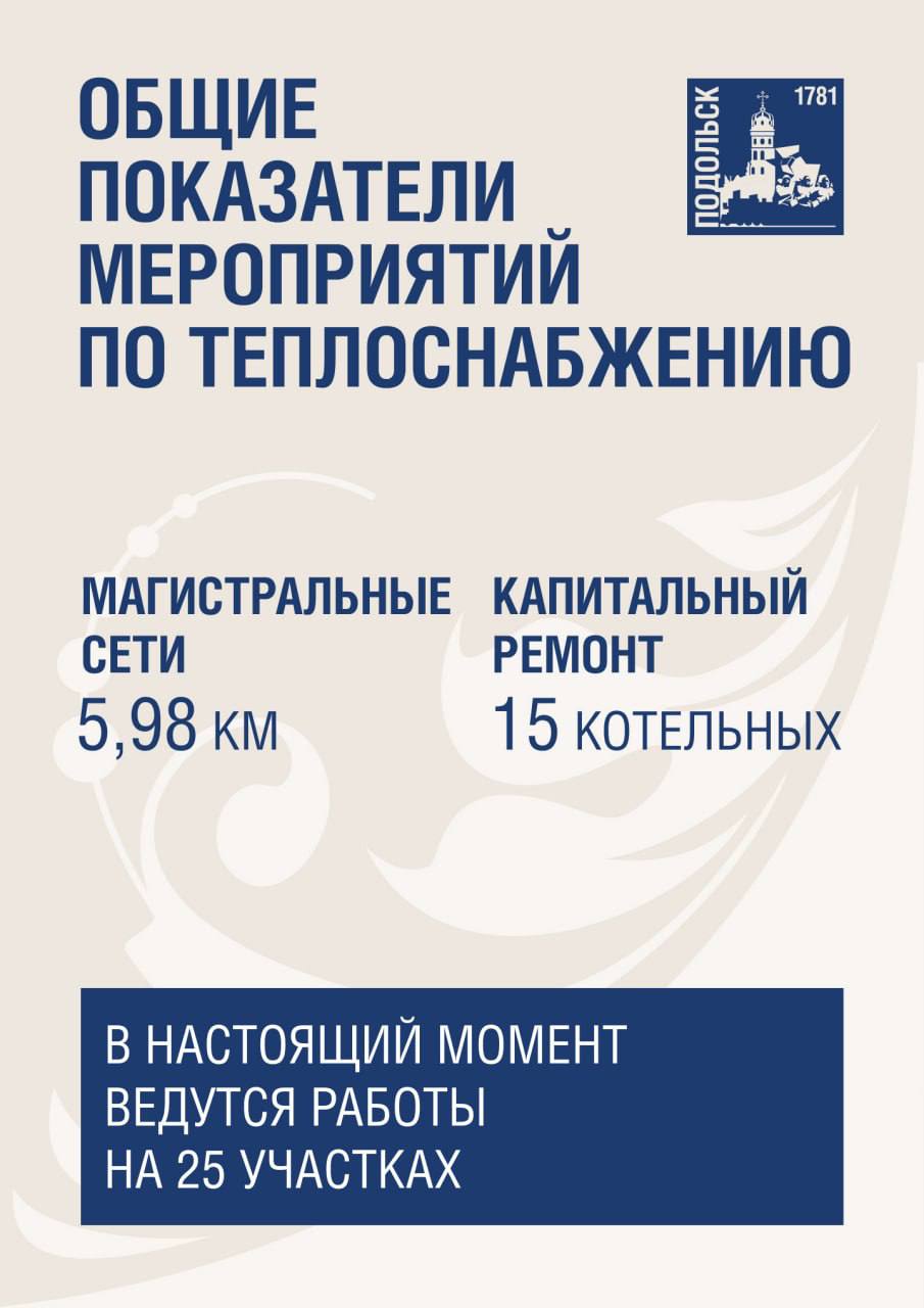Напомним, всего на территории Городского округа Подольск осуществляют деятельность 11 теплоснабжающих организаций, в обслуживании которых находится 95 котельных, 40 центральных тепловых пунктов, более 460 километров тепловых сетей.