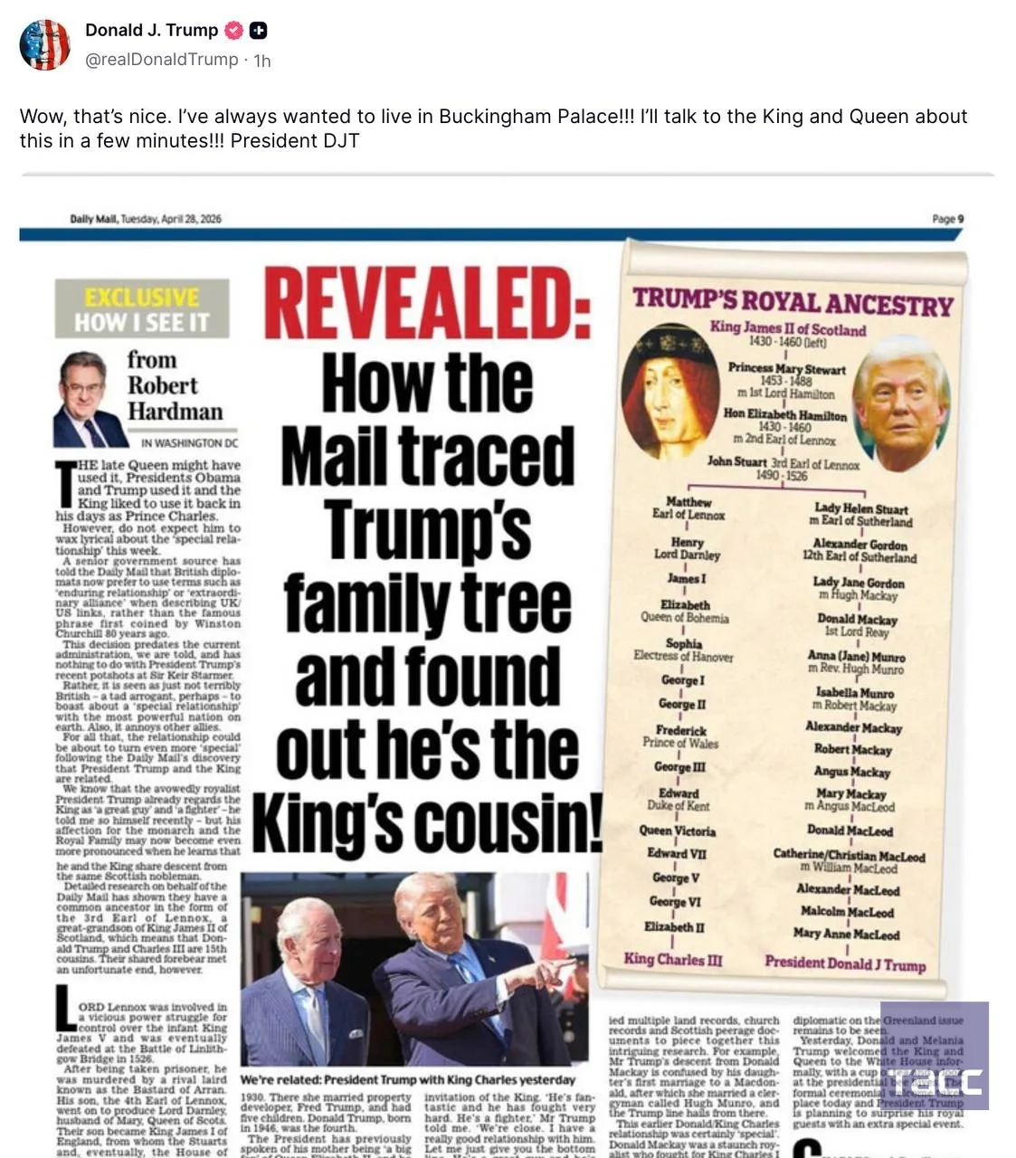 Трамп в ответ на статью в британской газете The Daily Mail, якобы изобличающую его родственные связи с британской королевской семьей, в шутку заявил о давнем желании жить в Букингемском дворце. Соответствующее сообщение он разместил в социальной сети Truth Social: