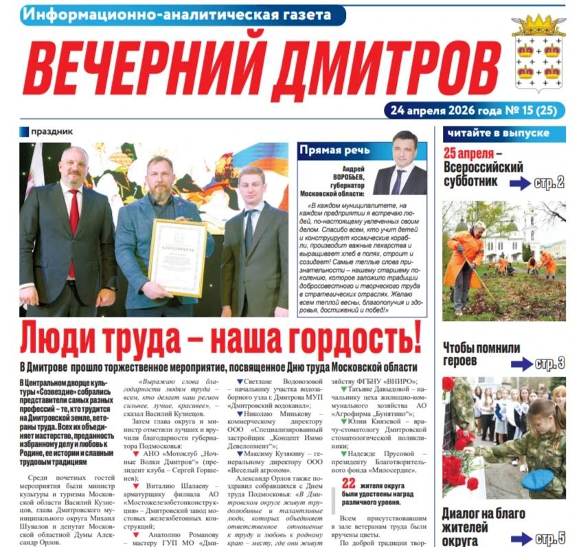 Если вы пропустили выпуск газеты «Вечерний Дмитров» от 24 апреля, вы можете ознакомиться с главными новостями округа в сферах ЖКХ, общественной жизни, а также с материалами рубрик «СВОих не бросаем», памятных, культурных, спортивных и праздничных мероприятий.