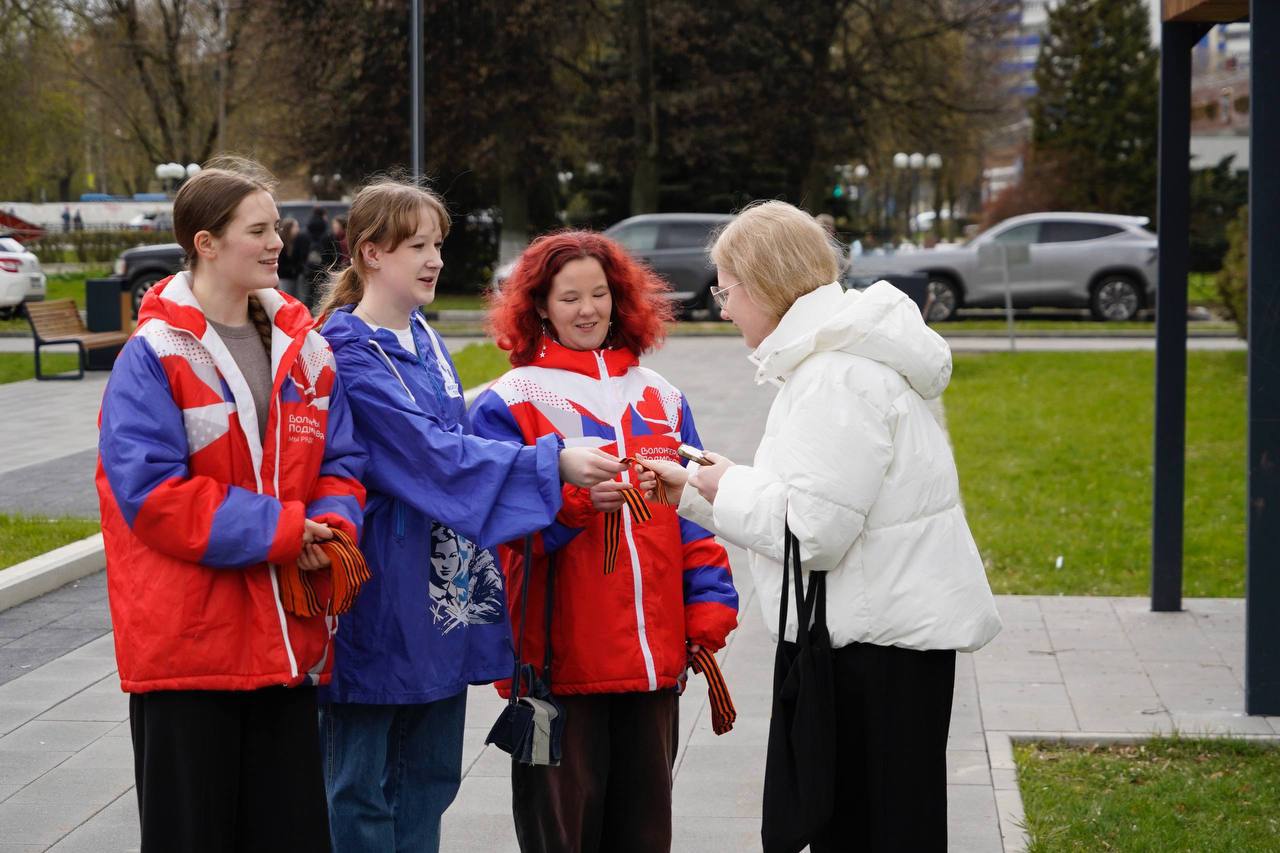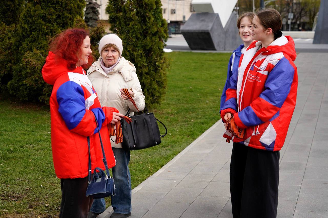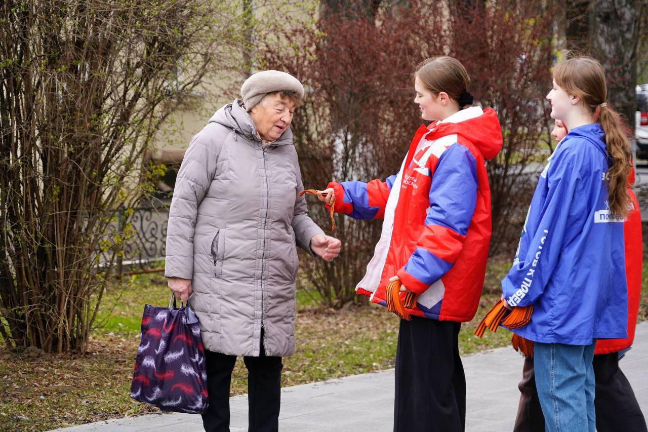 Волонтёры поздравляли прохожих с наступающим 9 Мая — 81-й годовщиной Великой Победы. Акция продлится до 9 мая – активистов с лентами можно будет встретить на улицах, в парках и скверах округа.