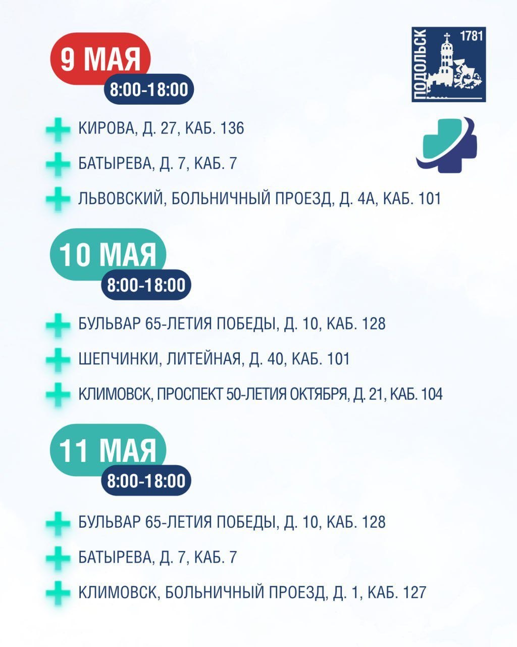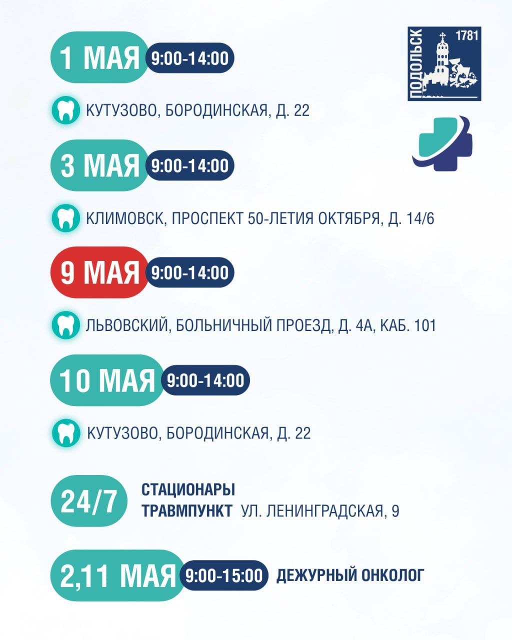 Кабинеты неотложной помощи поликлиник и стоматологические отделения будут работать в майские праздники. Подробнее – смотрите в карточках.