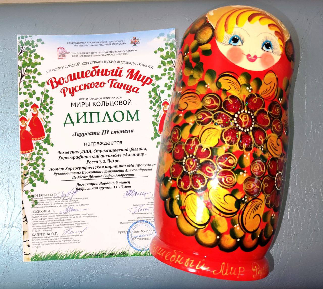 14 марта хореографический ансамбль «Альтаир» прд руководством Прокопович Елизаветы Александровны и педагога Деминой Софьи Андреевны принял участие в VIII Всероссийском конкурсе-фестивале «Волшебный мир русского танца» имени народной артистки СССР Миры Кольцовой.