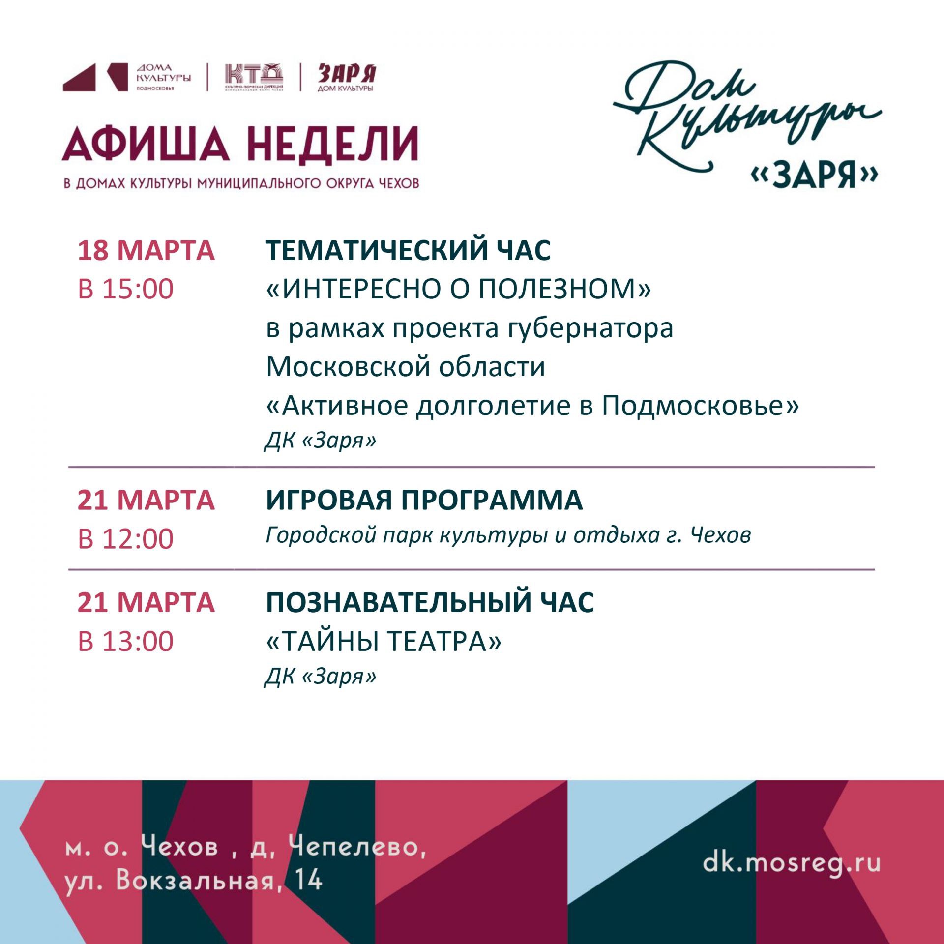 Анонс мероприятий на эту неделю в муниципальном округе Чехов