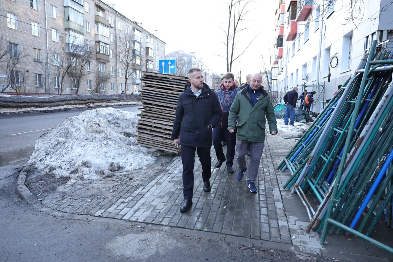 Заместитель главы городского округа Мытищи Александр Хаюров совместно с депутатской комиссией провел выездную проверку ремонта многоквартирных домов 21/6 и 23/7 на Новомытищинском проспекте, а также дома 5/17 на улице Мира и дома 8/40 на улице Щербакова, где проводится утепление фасадов.