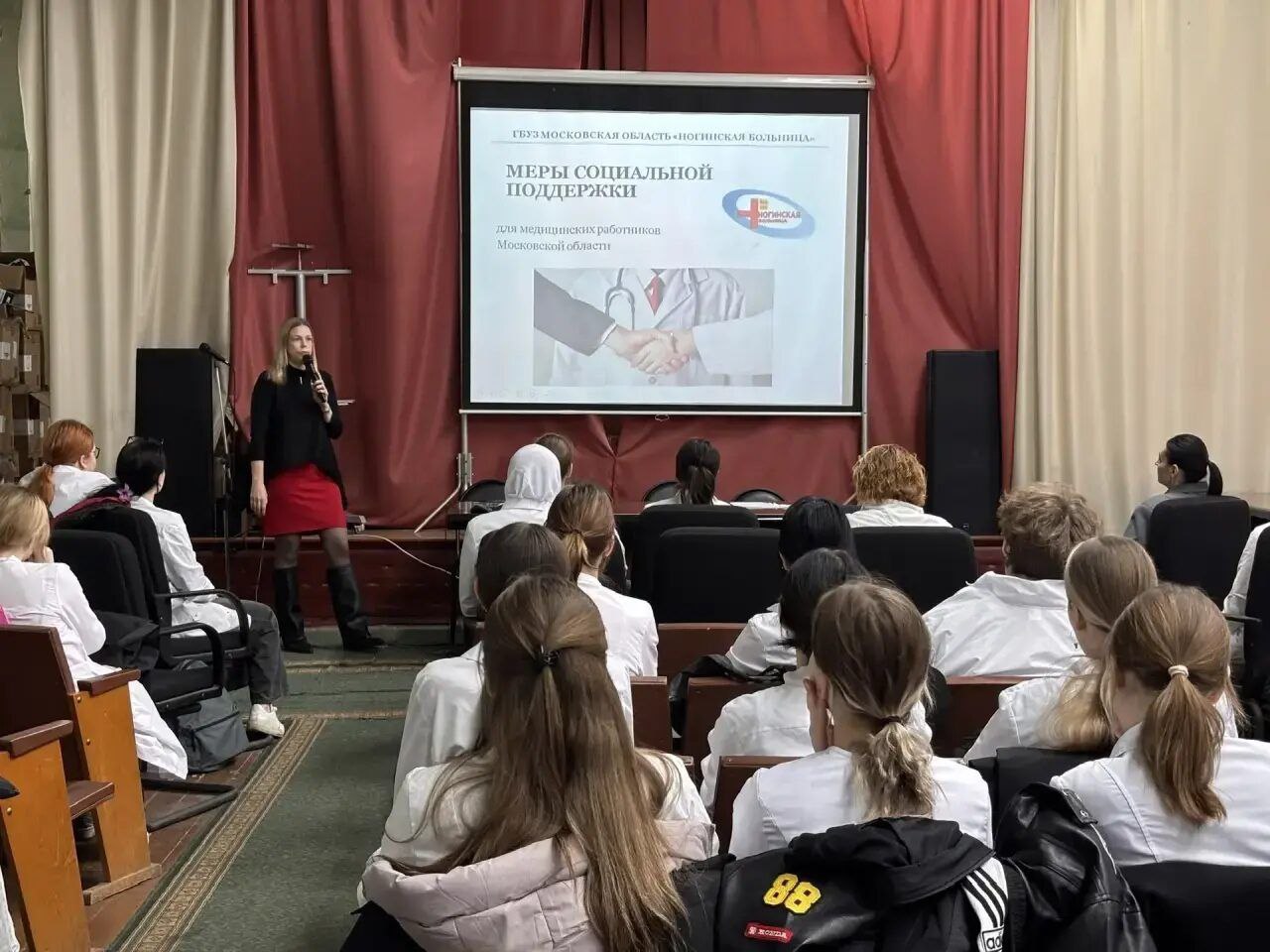 В Ногинской больнице состоялось профориентационное мероприятие для студентов первого курса Ногинского колледжа в рамках учебной дисциплины «Введение в специальность». С приветственным словом к студентам обратились главная медицинская сестра Надежда Блажевич и начальник отдела по персоналу Дарья Кондрашова. Они рассказали о специфике работы в системе здравоохранения, возможностях профессионального роста и важности выбора медицинской профессии.