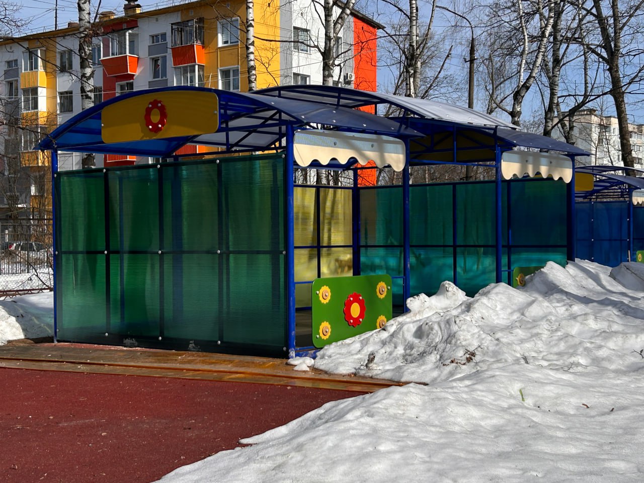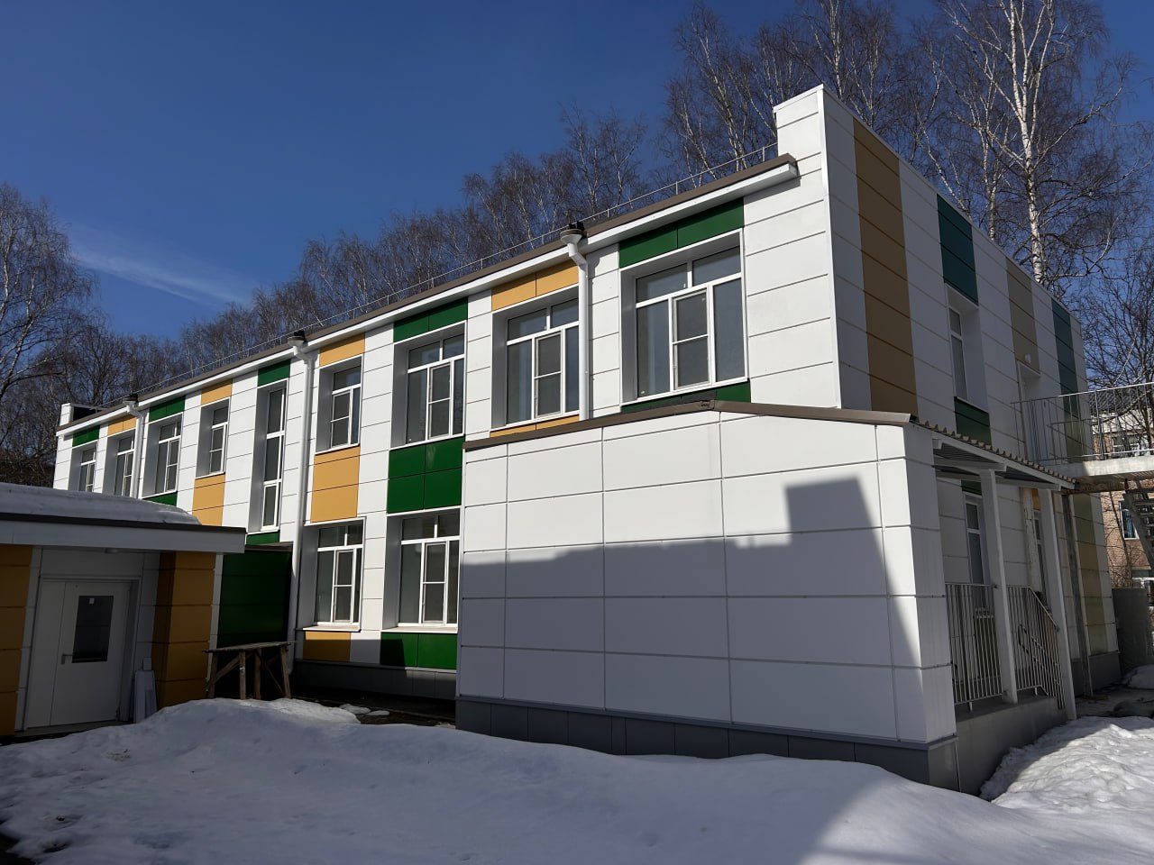 Территория вокруг учреждения уже полностью благоустроена: здесь появились обновленные асфальтовые дорожки, новый бордюрный камень и просторные игровые площадки. В настоящее время рабочие завершают установку теневых навесов, которые позволят детям проводить время на свежем воздухе независимо от погодных условий. Всего на территории оборудовано 11 игровых площадок с безопасным резиновым покрытием.