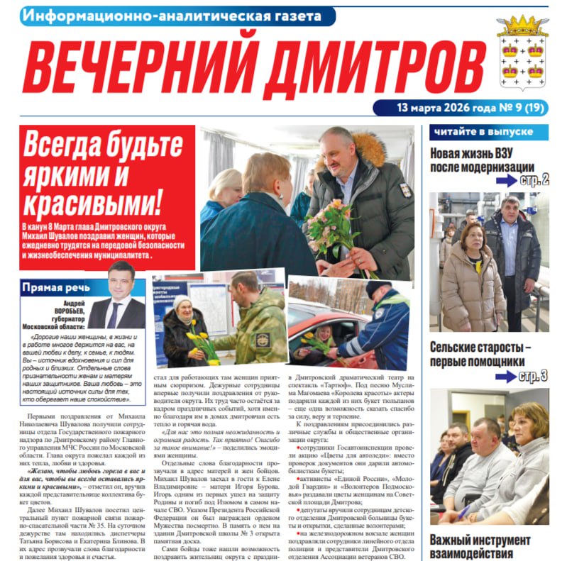 Если вы пропустили выпуск газеты «Вечерний Дмитров» от 13 марта, вы можете ознакомиться с главными новостями округа в сферах ЖКХ, общественной жизни, а также с материалами рубрик «СВОих не бросаем», памятных, культурных, спортивный и праздничных мероприятий.