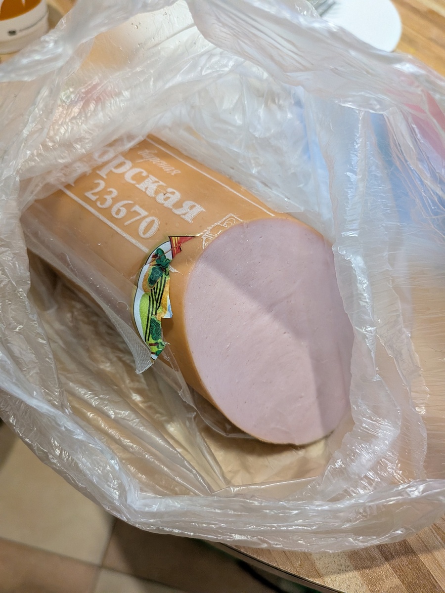 Интересный момент — состав колбасы оказался нанесён на упаковку. Главными ингредиентами стали свинина и говядина, а также молочные и яичные продукты. В целом, запах и текстура варёной колбасы не подкачали. Без лишних специй и с хорошей калорийностью в 228 ккал на 100 грамм, этот продукт неожиданно попал в список фаворитов.