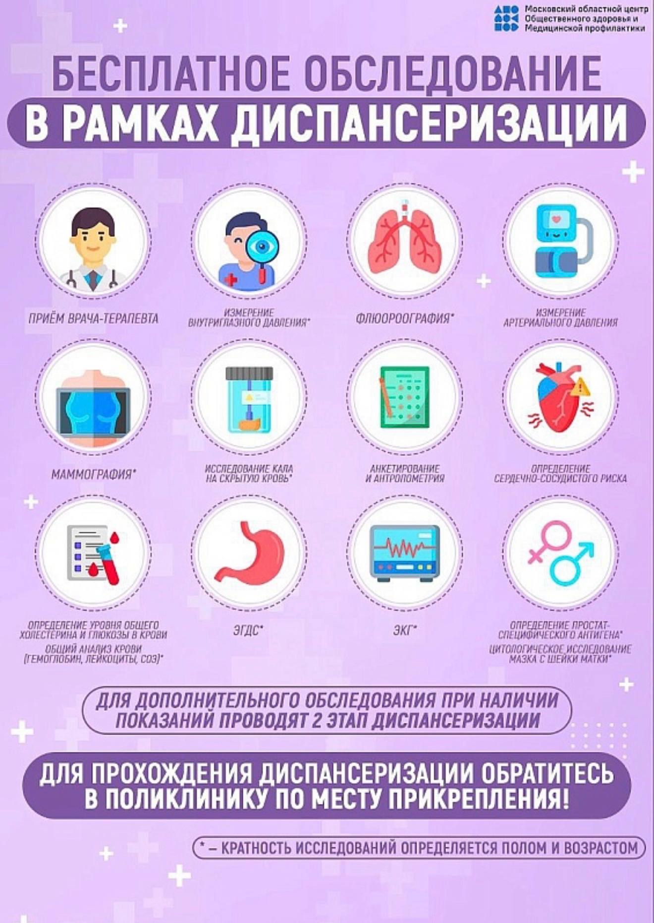 Необходим страховой медицинский полис и паспорт гражданина РФ. Обследования в рамках диспансеризации проводятся бесплатно!