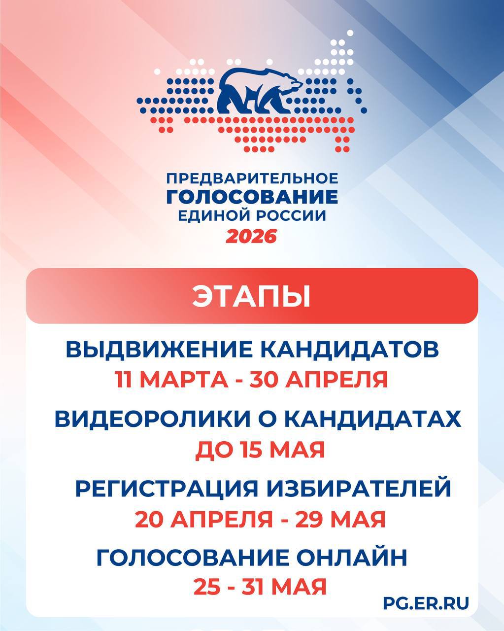 • 20 апреля — 29 мая — регистрация избирателей